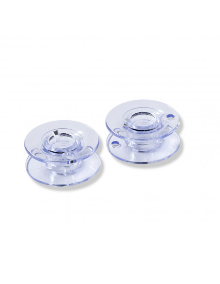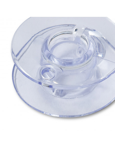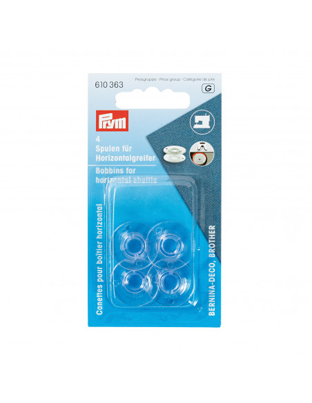 Le boucleur horizontal est un système qui ne nécessite pas de capsule pour la canette et auquel suffit une faible tension de fil. La gamme de Prym propose pour les machines avec ce type de canette des paquets de quatre canettes pareilles pour machines à coudre en plastique transparent en trois tailles différentes. Un grand avantage de la canette en plastique réside dans le fait qu’on a toujours la couleur du fil et la réserve de fil sous les yeux et on peut empêcher ainsi une coupure soudaine du fil de la canette. Prym offre ces canettes pour machines à coudre pour les marques JANOME, BROTHER, SINGER, BERNINA, HUSQVARNA et PFAFF dans les différentes versions correspondantes.