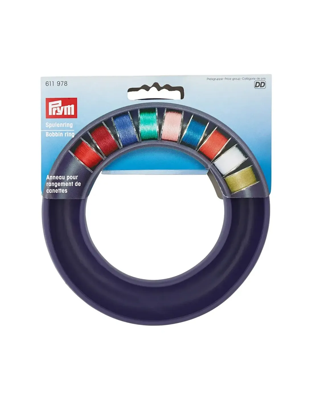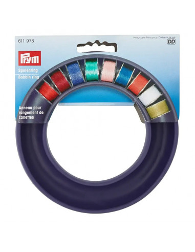 L’anneau pour rangement de canettes de Prym permet un rangement sûr et ordonné des canettes pour machines à coudre. L’anneau en plastique souple bleu prune peut accueillir jusqu'à vingt canettes et empêche également le débobinage du fil. Afin que les canettes de toutes tailles soient fermement maintenues, il peut être modélisé à la forme désirée par une astuce simple. On le met dans l’eau bouillante pendant 15 à 20 secondes et on ajuste les deux bords au diamètre des canettes. En le plongeant brièvement dans de l'eau froide, il retrouve sa dureté initiale et reste sous la forme modelée.