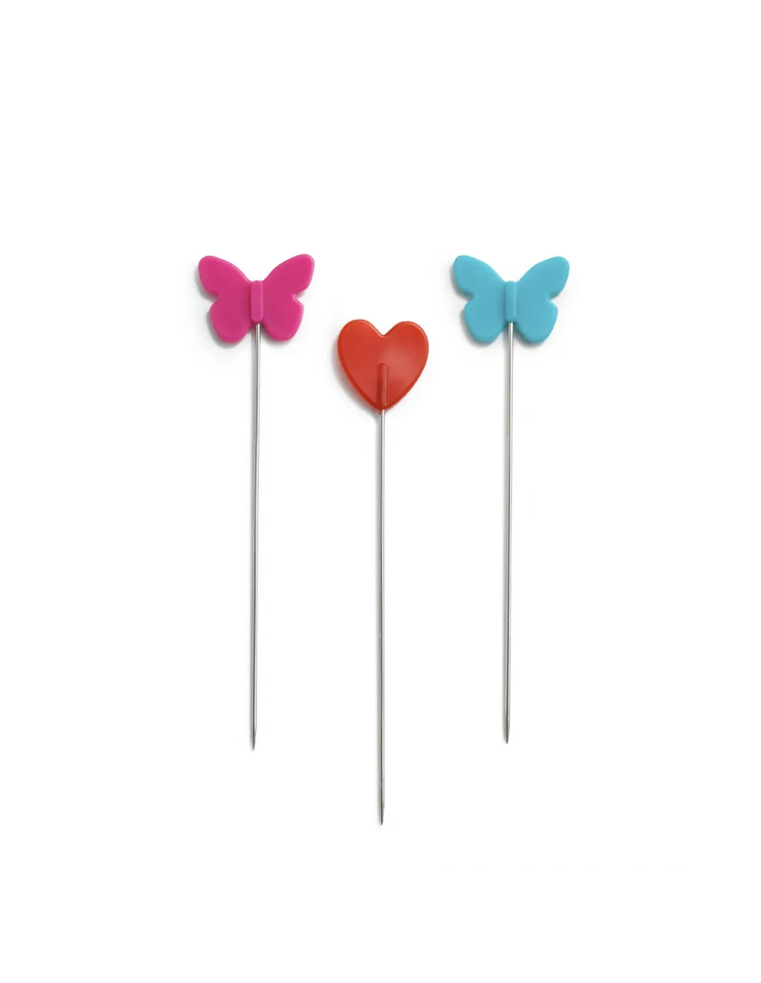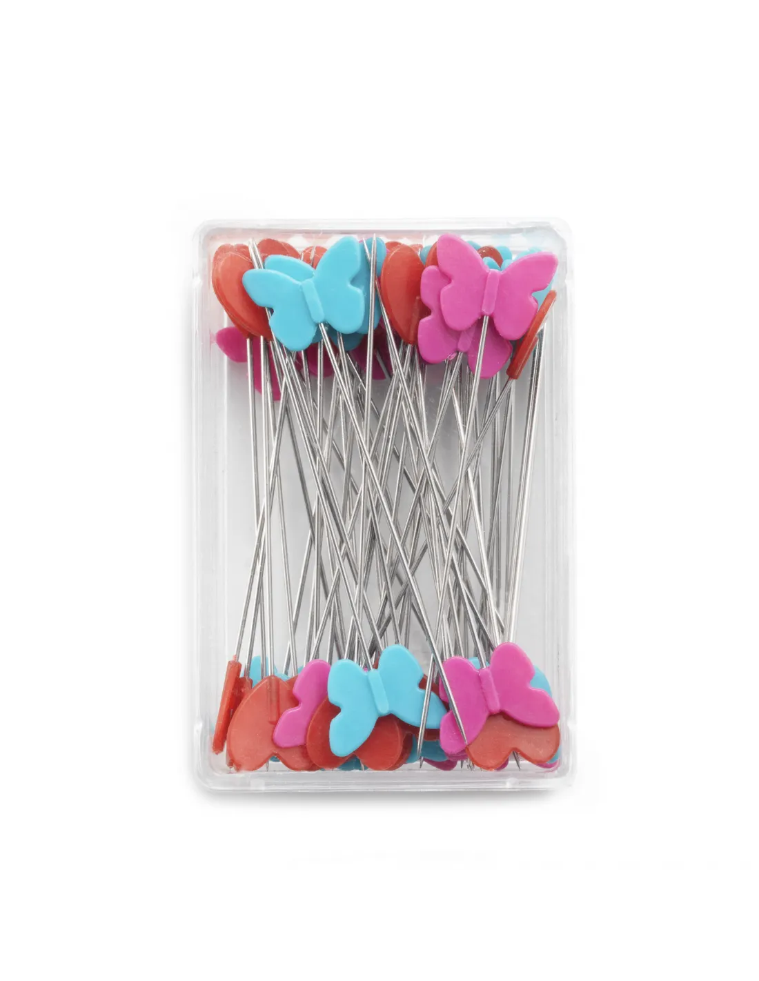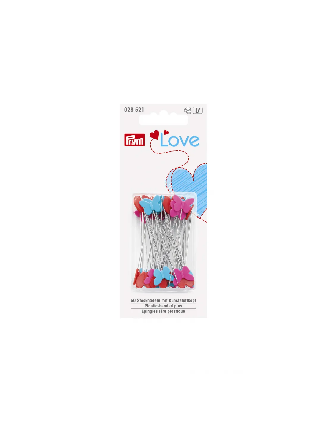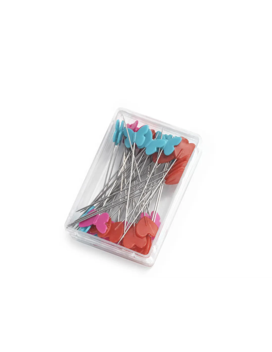Ces longues épingles de 50 x 0,60 mm en acier inoxydable de la gamme Prym Love sont garnies de jolies têtes en plastique en forme de cœur ou papillon et sont un vrai point de mire pour les petits et les grands amateurs de couture. La jointure extrêmement stable entre la tige et la tête lui confère une capacité de sollicitation élevée. La pointe fine pénètre facilement à travers plusieurs couches de tissu sans endommager les fibres. Les têtes en plastique des épingles peuvent être bien tenues en main et sont très décoratives. Prym offre ces épingles en 50 pièces dans une boîte en plastique transparent sur une carte libre-service.