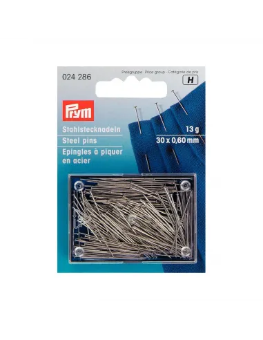 Ces épingles á piquer sont le premier choix pour les tailleurs professionnels et amateurs pour les travaux de marquage. Les épingles en acier trempé ont non seulement une bonne protection contre la rouille mais disposent aussi d’une dureté du ressort bien équilibrée. Leurs pointes effilées pénètrent en douceur à travers tous les tissus en protégeant les fibres et par leur tête de forme spéciale, elles peuvent être saisies et insérées de façon optimale. Prym offre ces épingles à piquer en acier universelles dans différentes boîtes de rangement.