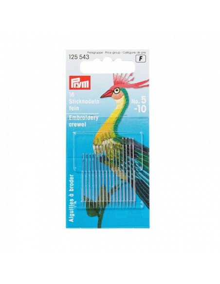 Les aiguilles à broder fines appelées « Crewel » en acier trempé sont particulièrement appropriées pour la broderie et la couture. Les aiguilles ont la pointe conique et allant en s’amincissant typique d'une aiguille à coudre. Elles disposent d’un chas relativement grand facilitant l’enfilage. Le revêtement uniforme et sans porosités garantit le glissement facile de l’aiguille à travers le tissu. La gamme d’aiguilles à broder fines « Crewel » comprend les tailles No. 3 à No. 9 et offre pour chaque exigence de broderie l'aiguille appropriée. Prym offre également deux sets assortis de ces aiguilles à tapisserie avec/sans pointe spéciales dans les tailles No. 3-9 et No. 5-10. Tous les paquets contiennent 16 aiguilles.