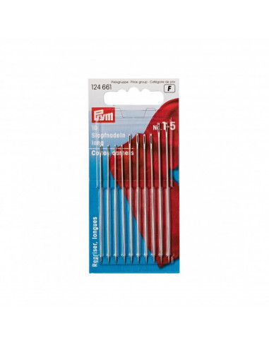 La gamme d'aiguilles à repriser en acier trempé propose des aiguilles courtes pour repriser les vêtements de laine et les chaussettes ainsi que les longues aiguilles pour les travaux de reprisage fins. Les aiguilles ont la forme conique et allant en s’amincissant d'une aiguille à coudre, mais sont beaucoup plus grandes et ont donc un chas proportionnellement plus grand. Cela permet également l’enfilage de fils et de laine stables. La surface des aiguilles à repriser est revêtue sans bavures et résistante à la corrosion. Elle permet d’introduire facilement l'aiguille à travers le matériau. Prym dispose de ces aiguilles à repriser longues et courtes en deux sets assortis avec 6 ou 10 aiguilles de haute qualité.