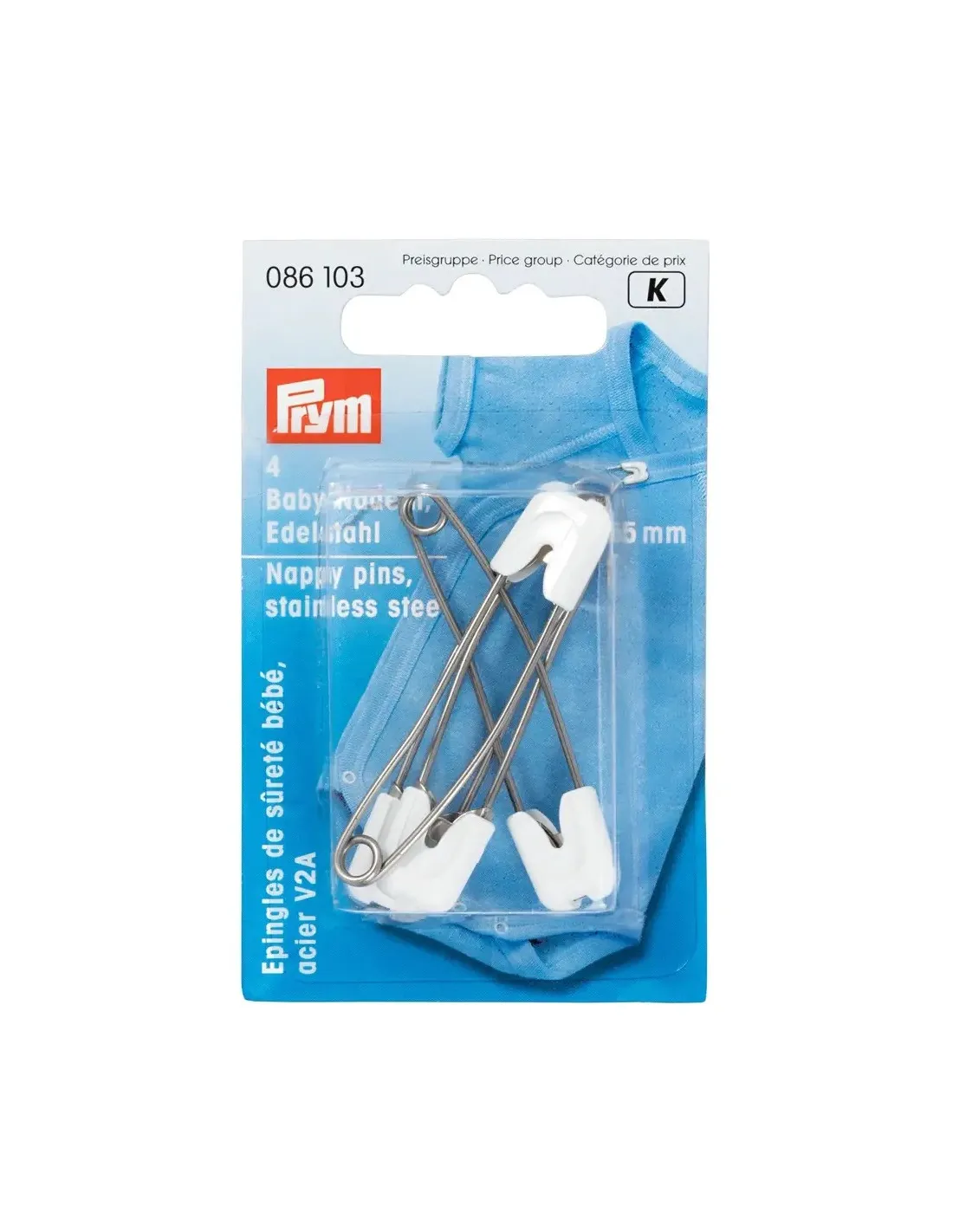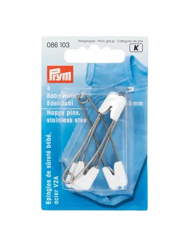 Si vous avez des enfants, vous vous souvenez d’avoir fermé à contrecœur les grenouillères, les couches en tissu ou autres avec des épingles de sûreté. Pour garantir que les épingles ne s’ouvrent pas involontairement, Prym offre dans ce cas les épingles de sûreté pour bébé avec double fermeture. Un capuchon plastique sur la capsule de fermeture verrouille en outre l'aiguille en acier inoxydable de haute qualité et ne la libère que quand le capuchon est relevé. Les épingles avec sécurité enfants sont disponibles dans les couleurs rose, bleu clair et blanc. Pour un grand confort de port, les deux tiges d’aiguilles sont légèrement incurvées dans une direction. Ainsi elles sont parfaitement adaptées aux courbes du corps.