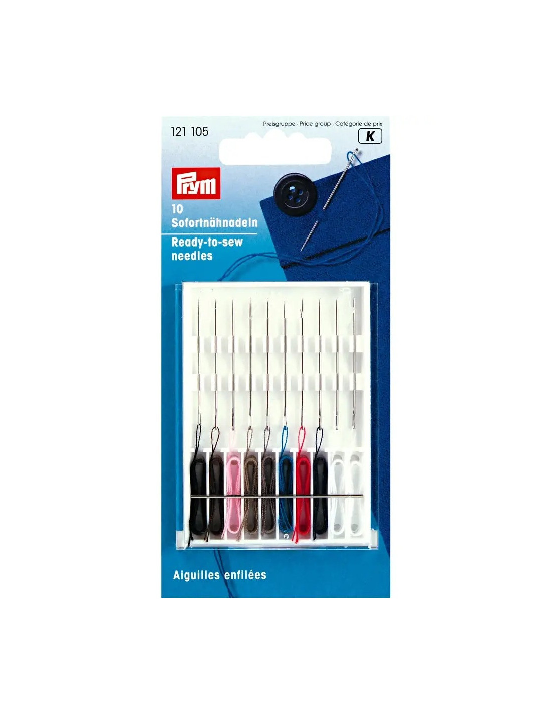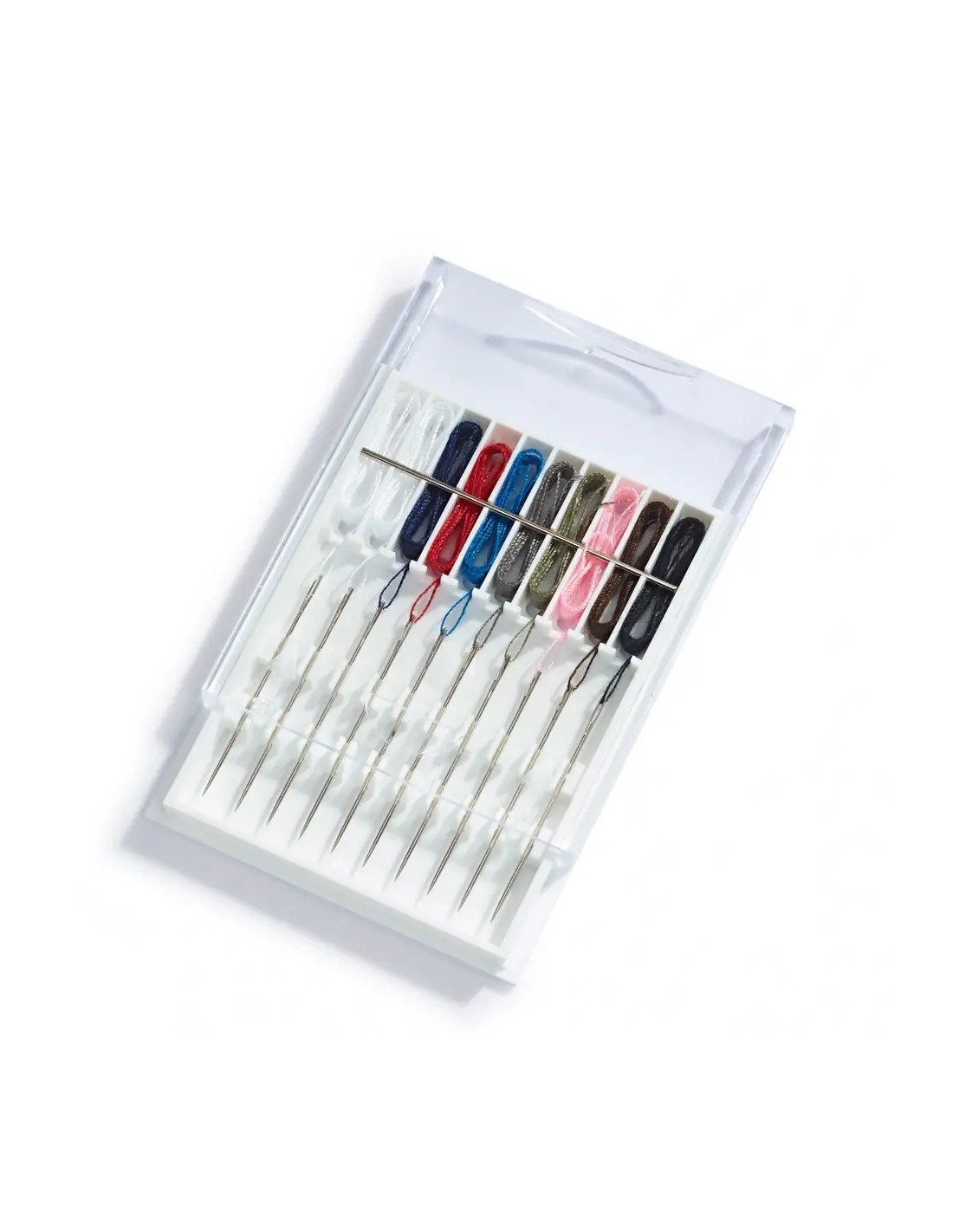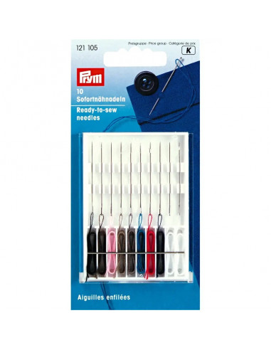 Si vous êtes en cours de route et une couture sautée doit être réparée, l'assortiment de Prym offre ce set pratique de 10 aiguilles à coudre avec un fil déjà enfilé en neuf couleurs différentes dans une boîte en plastique. Toutes les aiguilles sont en acier inoxydable trempé. Une surface non poreuse et de fines pointes polies assurent une bonne capacité de glissement et de pique. En plus, elles sont résistantes à la flexion et ont un chas argenté sans bavure. Les fils enfilés en 100 % polyester en blanc, rose, rouge, bleu, brun et noir sont longs d'environ 50 cm. En ouvrant le couvercle transparent, les aiguilles sont immédiatement à portée de main et prêtes à être utilisées.