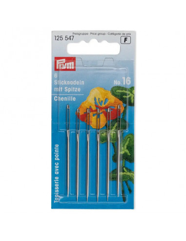 Les aiguilles à tapisserie avec pointe sont parfaitement adaptées pour la broderie de soie et la broderie fine. Les aiguilles en acier trempé sont complètement sans bavure et pourvues d’un chas perforé de façon symétrique. Le chas des aiguilles à tapisserie est en conséquence grand pour enfiler facilement laine ou fils grossiers. La pointe finement polie et la surface revêtue lisse permettent d’introduire facilement les aiguilles à travers tous les matériaux. Un rapport équilibré de puissance et de longueur leur donne également une bonne élasticité.