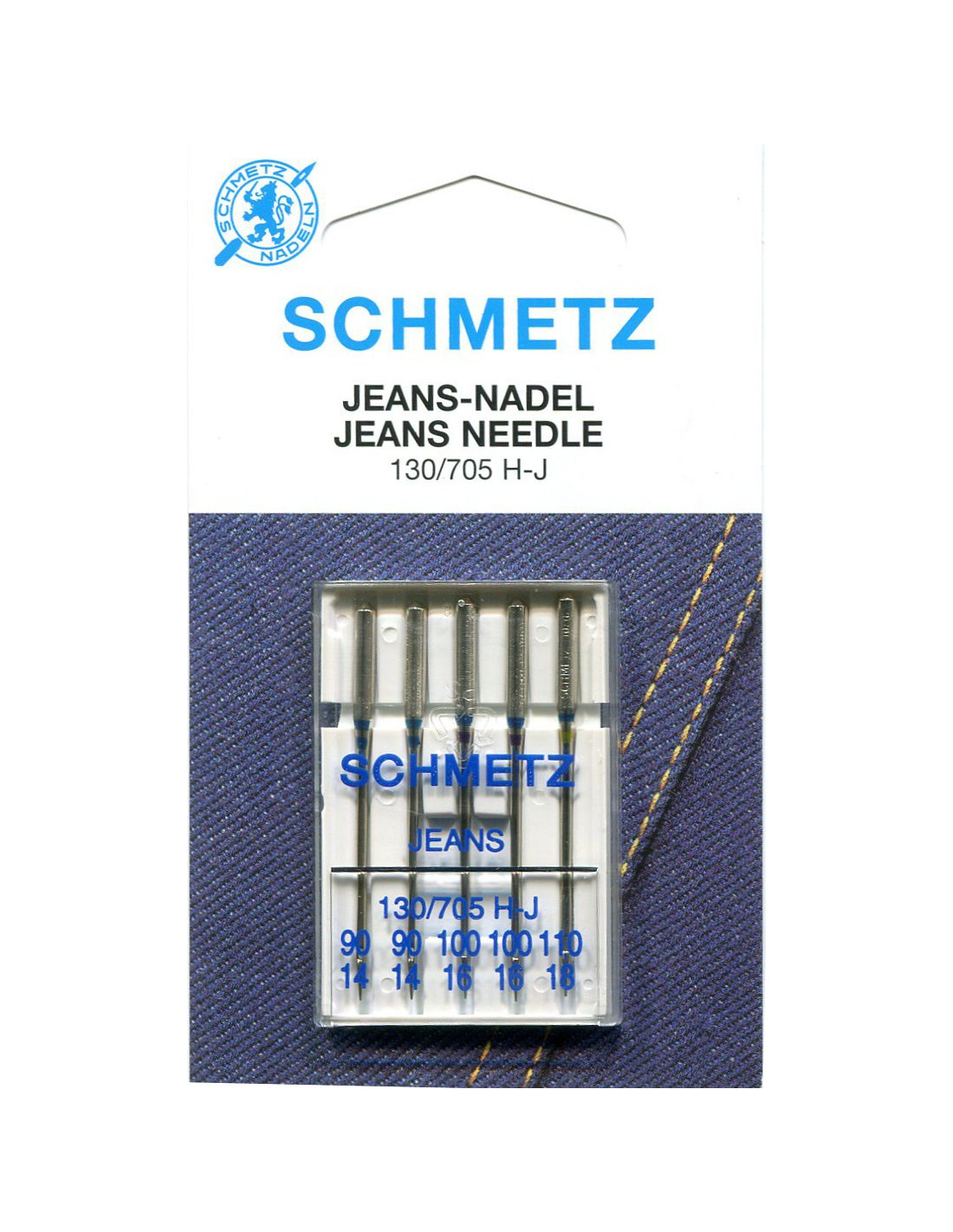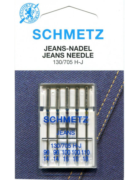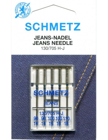 5 aiguilles machine "spécial jeans" assorties. La pointe à bille moyenne pénètre plus facilement les tissus épais et serrés sans abîmer la matière. La tige renforcée dévie moins et réduit le risque de points de manque et de casses d'aiguilles. Pour le Denim (jeans) et matières semblables très serrées.