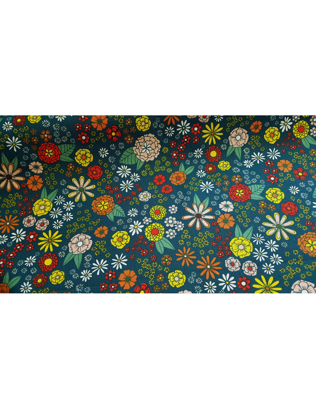 Tissu demi-natté fleurs sur fond vert canard. Tissu un peu épais (bachette).