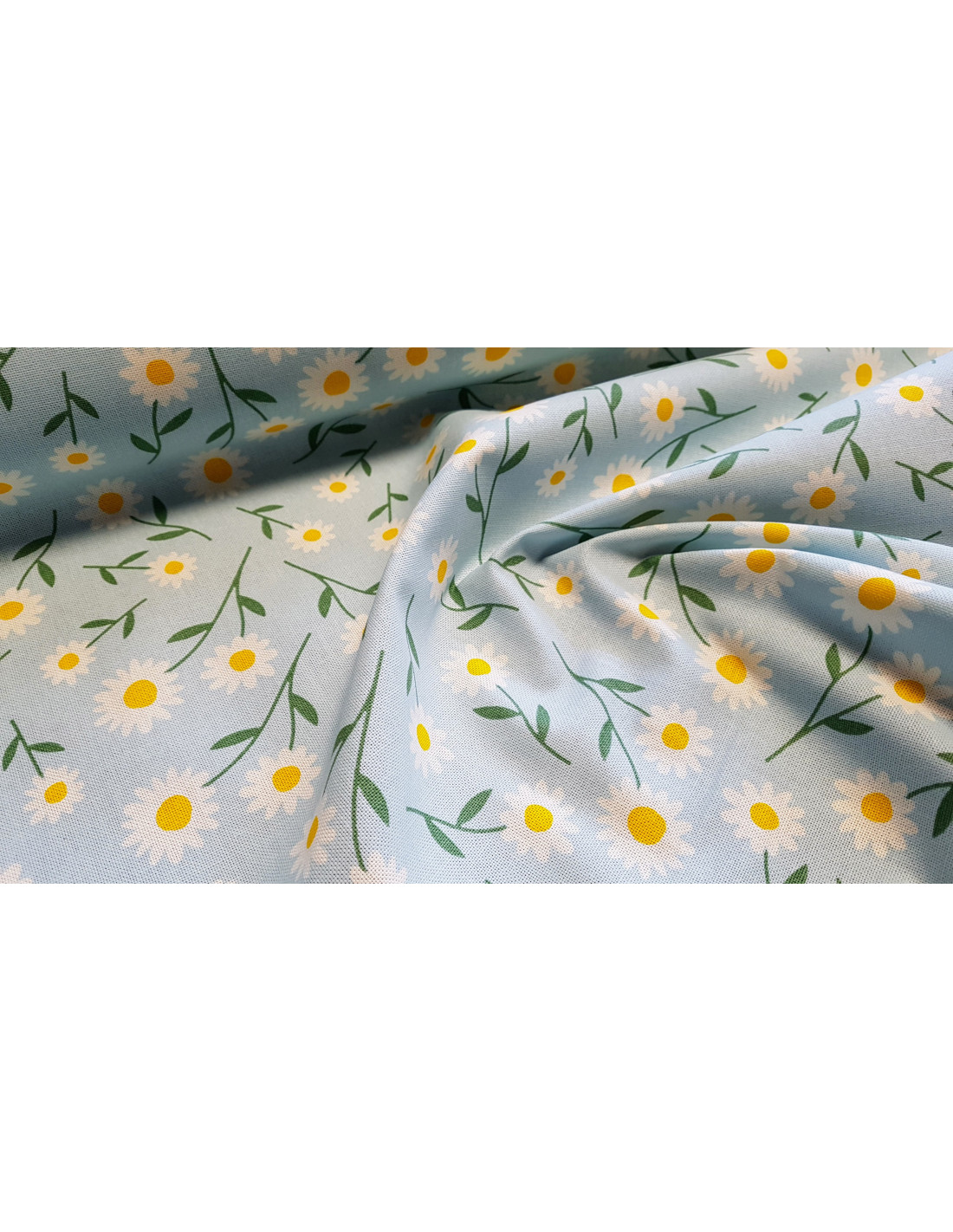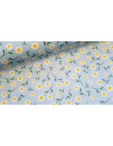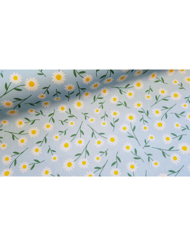 Tissu demi-natté, thème pâquerettes sur fond bleu ciel. Tissu un peu épais (bachette).
