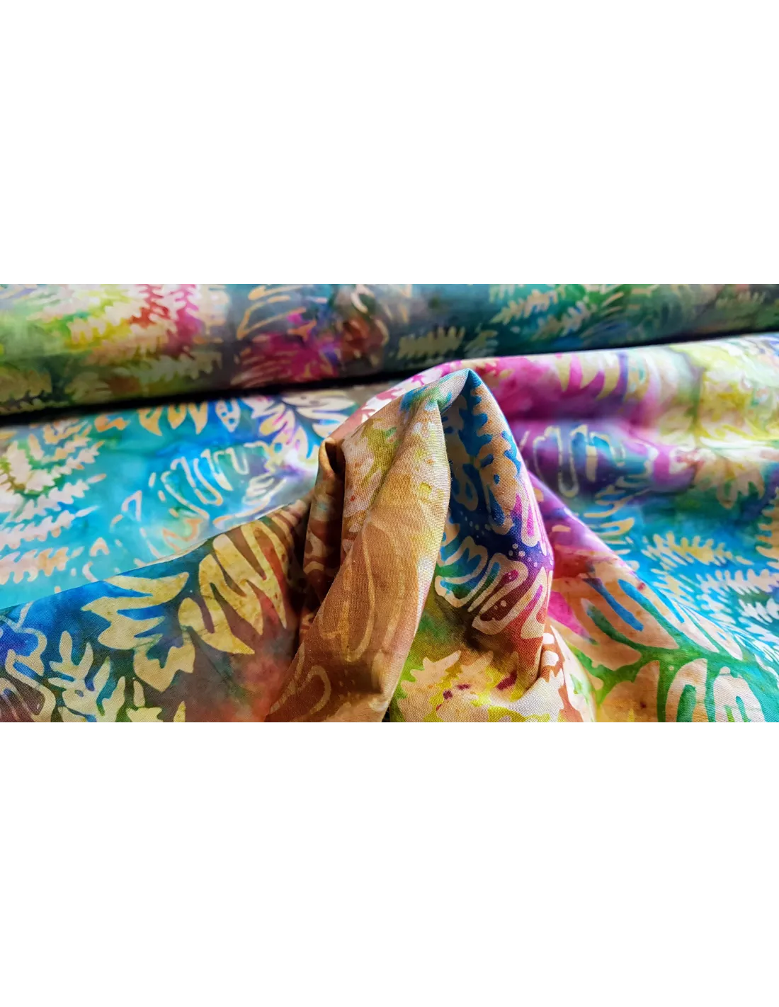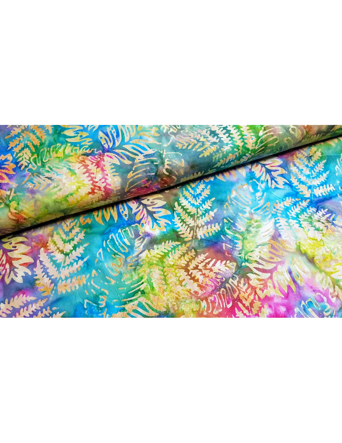 Batik de coton a imprimés feuilles sur fond multicolores. En 112cm de large.