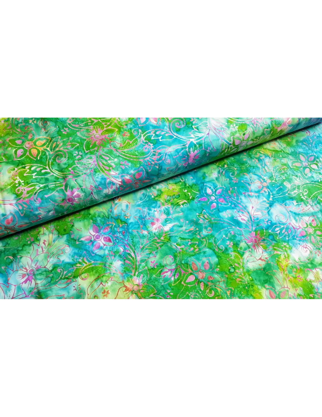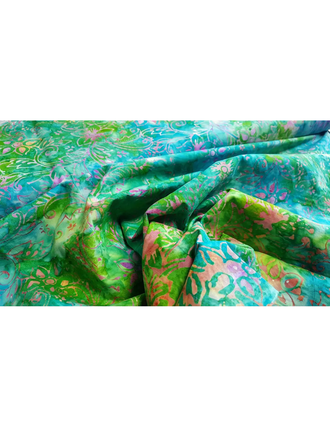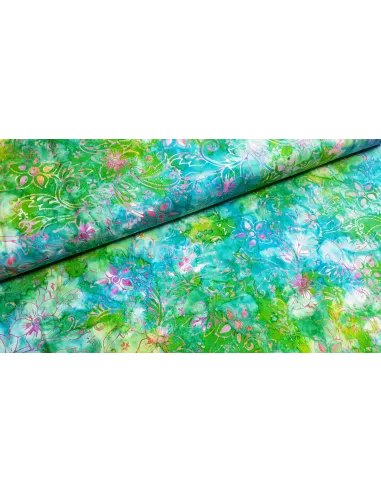 Batik de coton a imprimés fleurs dans les tons rose et vert. En 112cm de large.