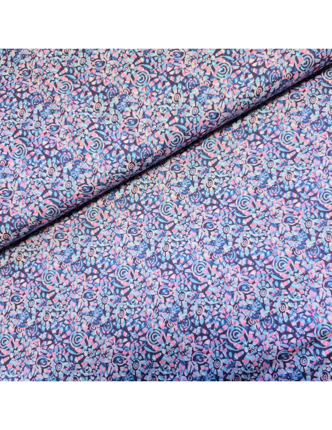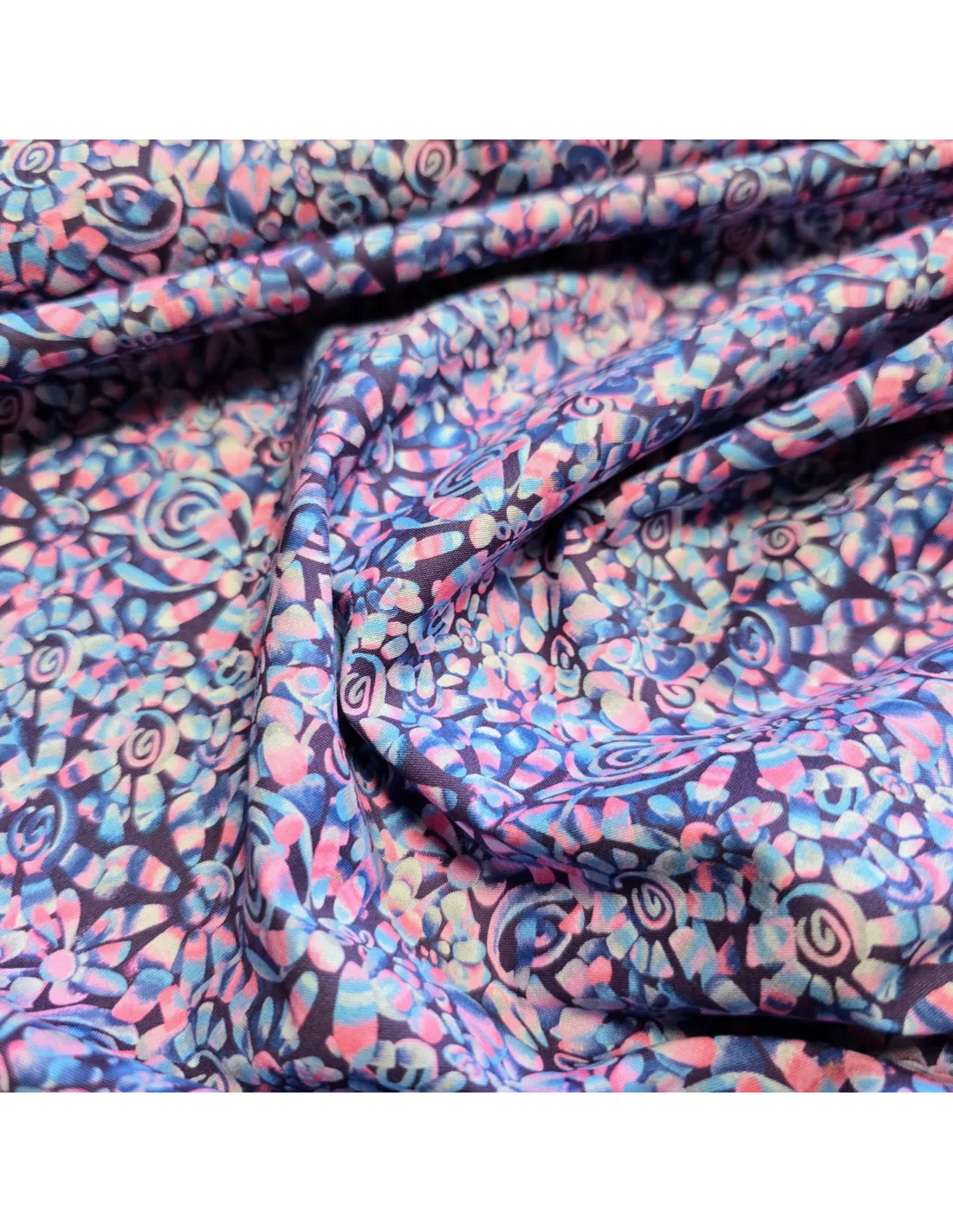Popeline de coton, impression digitale esprit batik. Conviendra pour l'habillement. Touché doux et souple.