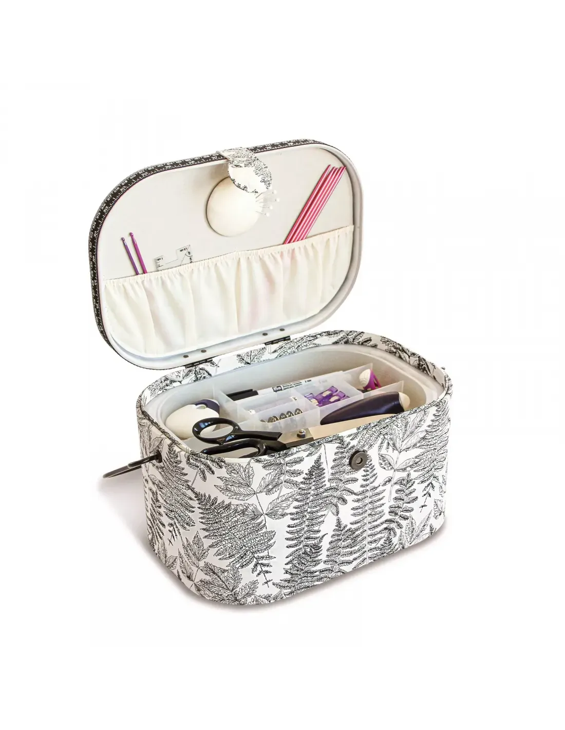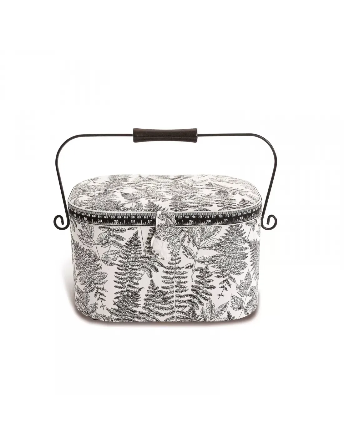 Une aide utile pour le rangement qui vous enchantera par son design vintage: Tous les accessoires de couture peuvent être bien rangés dans ce grand coffret à ouvrage. En plus de l'intérieur spacieux, un insert transparent en plastique avec sept compartiments pratiques offre suffisamment d'espace pour la mercerie de couture. Une pelote mousse et deux sacs en tissu cousus pour d’autres accessoires sont intégrés dans la partie inférieure du couvercle. La finition soignée est complétée par l’anse courbée en acier avec manche en bois. Le panier à ouvrage est grâce à la combinaison du design attrayant et aux divers espaces de rangement un panier idéal pour la pièce de couture ou pour le transport aux cours de couture. Le mètre ruban sur le bord du couvercle et les motifs feuilles en noir et blanc donnent à ce grand panier à couture un look tout à fait particulier.