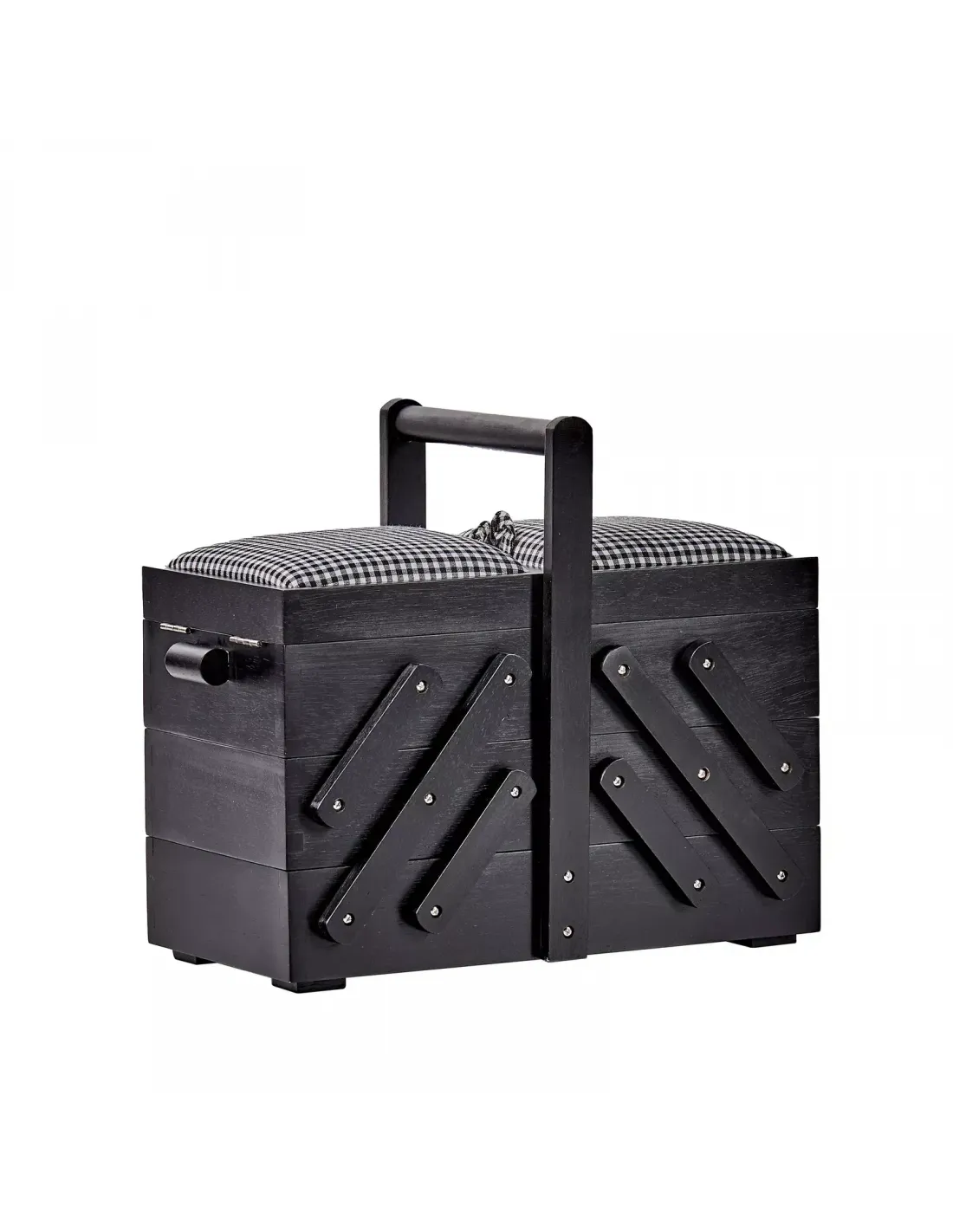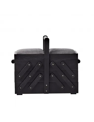 La travailleuse en bois de Prym est un excellent choix pour ranger vos accessoires de couture avec style. Le bois d’hévéa de qualité supérieure et peint en noir confère à ce panier à couture de taille moyenne un look élégant. Son design classique s’accompagne de finitions d’excellente qualité. Aiguilles, fils, ciseaux et marqueurs se répartissent sur 3 niveaux : grâce au système en accordéon, tous les accessoires de couture sont parfaitement rangés et rapidement à portée de main. Les compartiments supérieurs de la travailleuse noire sont munis de cloisons amovibles afin d’assurer une répartition homogène. Vous apprécierez ses finitions de qualité jusque dans les moindres détails. Le point fort de cet article est son couvercle. Avec son design classique à carreaux vichy noir et blanc, le couvercle en tissu rembourré ne se contente pas de compléter à merveille le look intemporel de la travailleuse en bois : il sert également de coussin à aiguilles afin que vous ayez toujours vos épingles à portée de main.