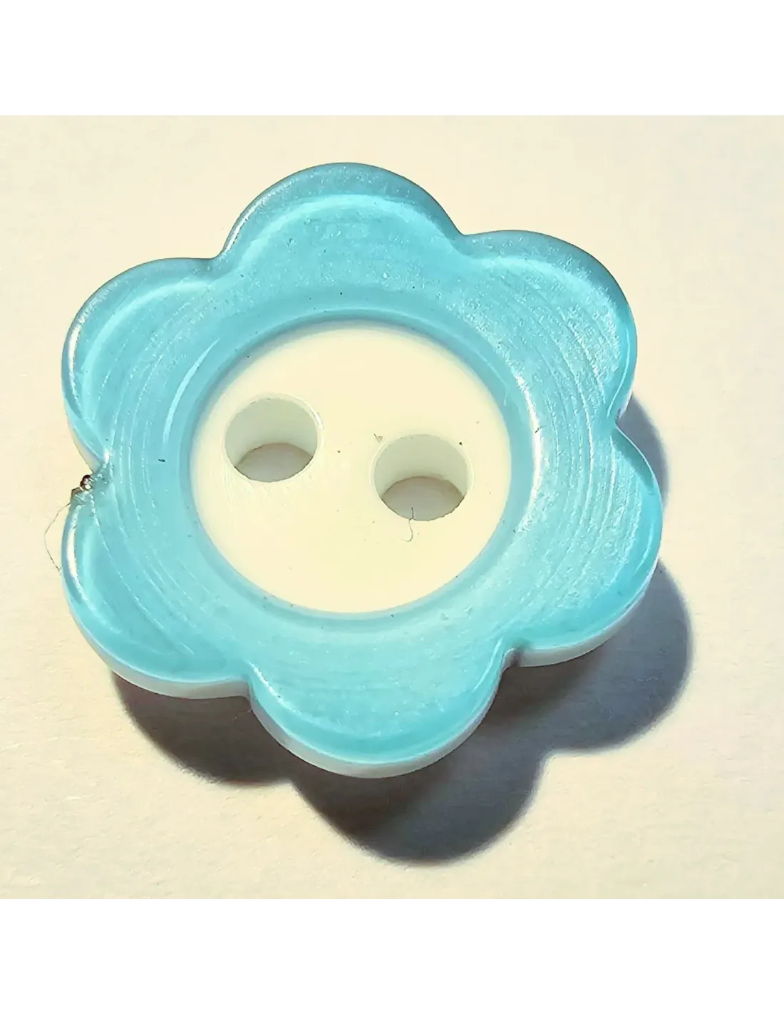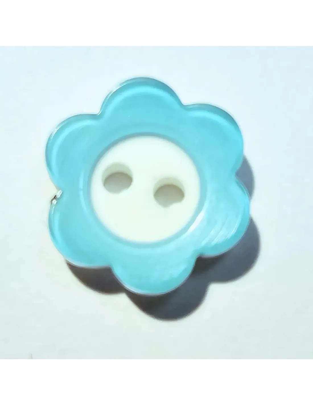 Bouton polyester 2 trous, 12mm, petite fleur turquoise