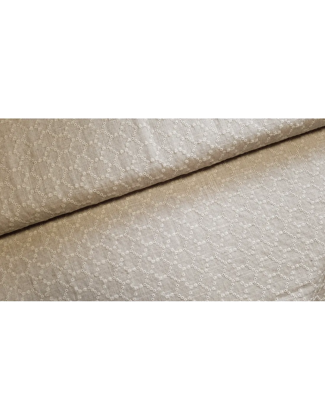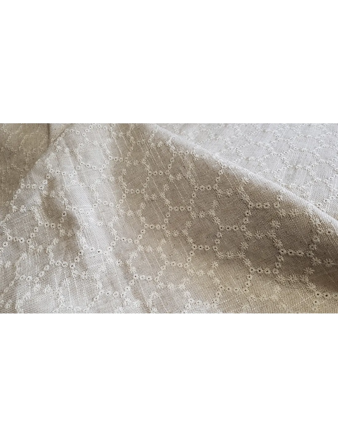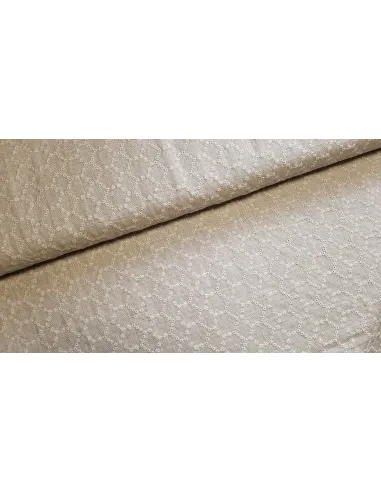 Broderie anglaise sur tissu mélangé lin, viscose et coton. Ce qui lui donne un aspect naturel et une fluidité très agréable. Convient bien pour un petit haut d'été ou une robe...