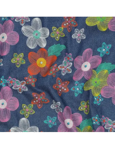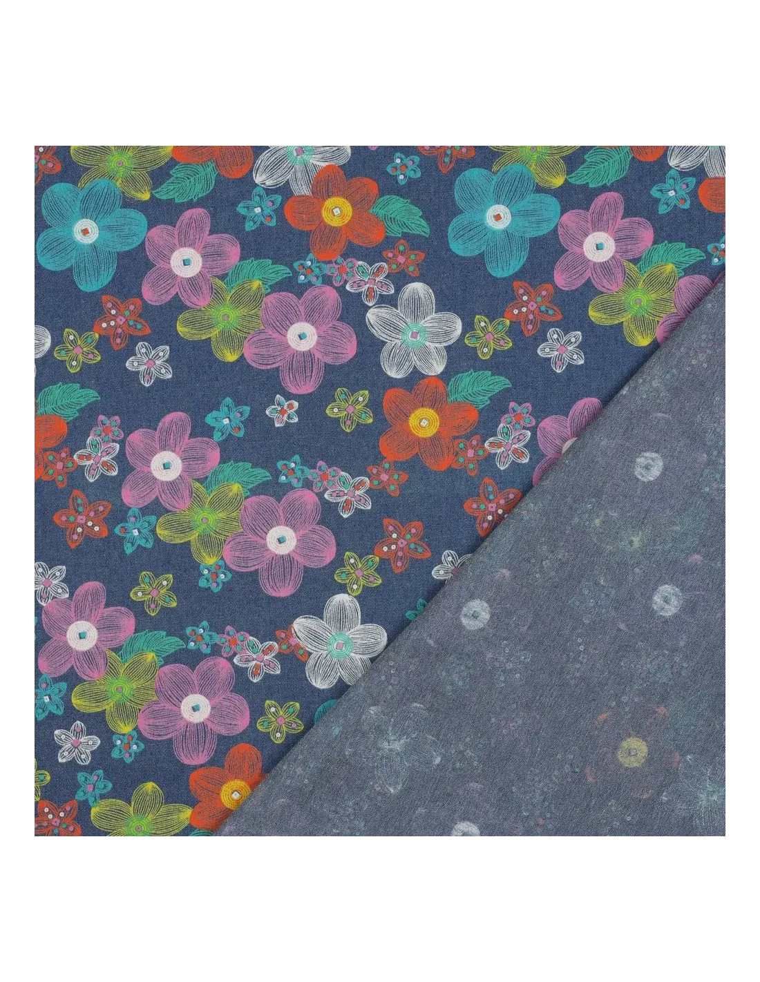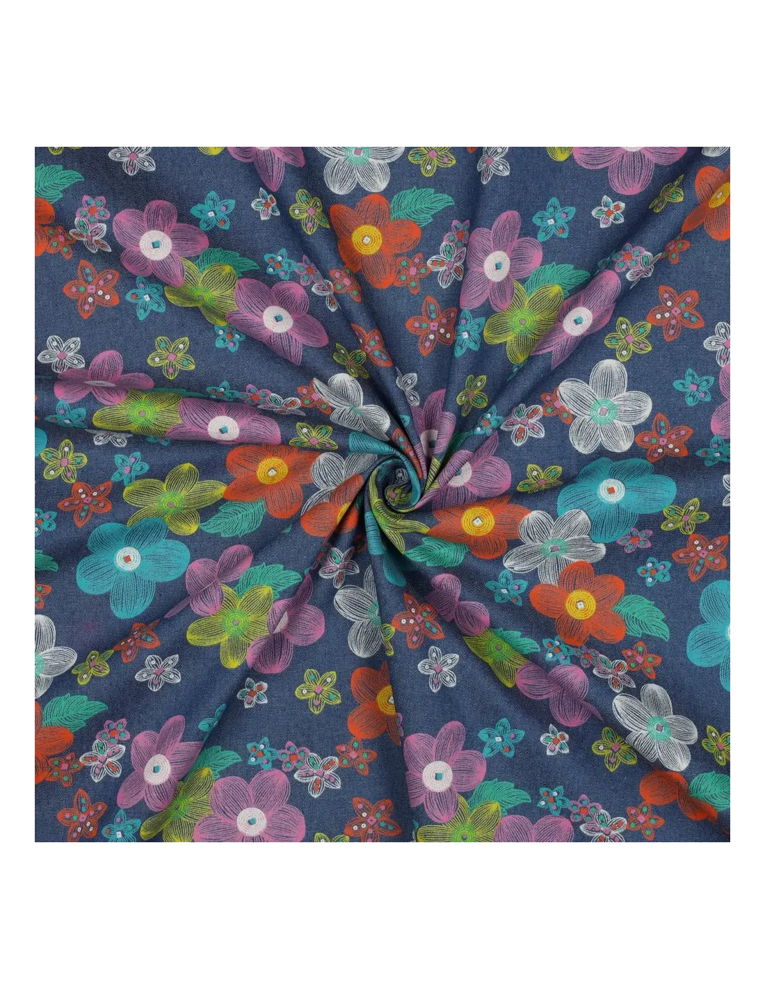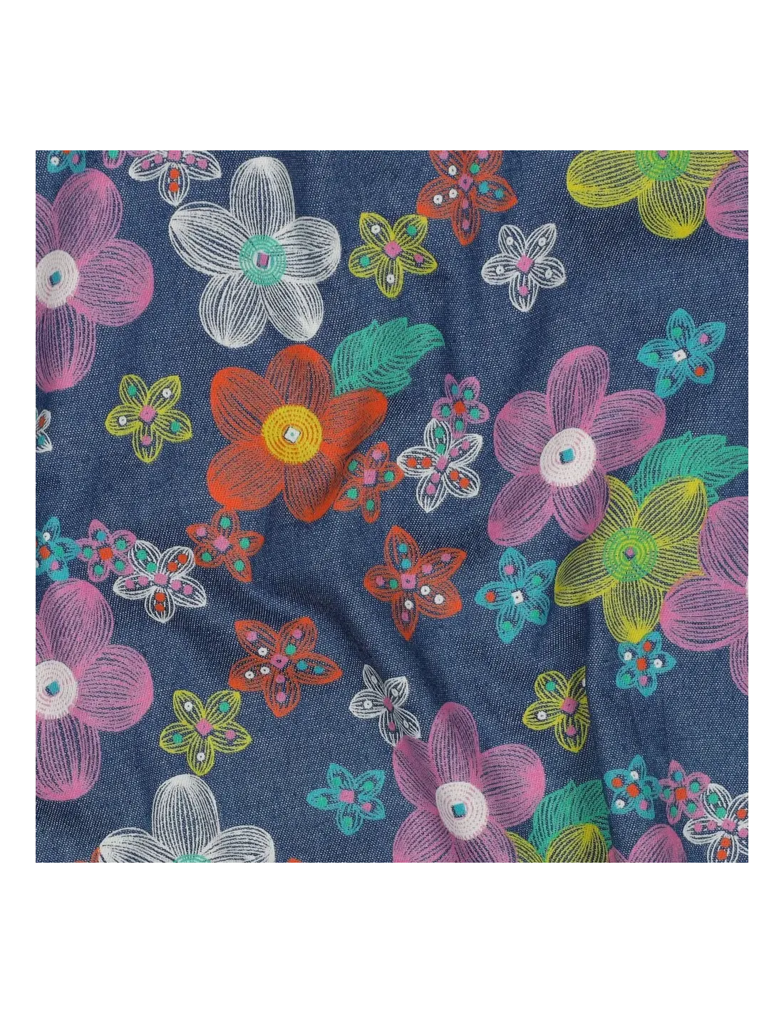 Découvrez notre coton chambray qui allie le charme intemporel de la toile de jean à la délicatesse d'un motif floral. Ce tissu souple est sublimé par une impression de fleurs colorées, apportant une touche de gaieté et de fraîcheur à son aspect classique. Les couleurs lumineuses des fleurs se marient parfaitement à la texture chinée du chambray, créant un effet visuel unique et plein de caractère.