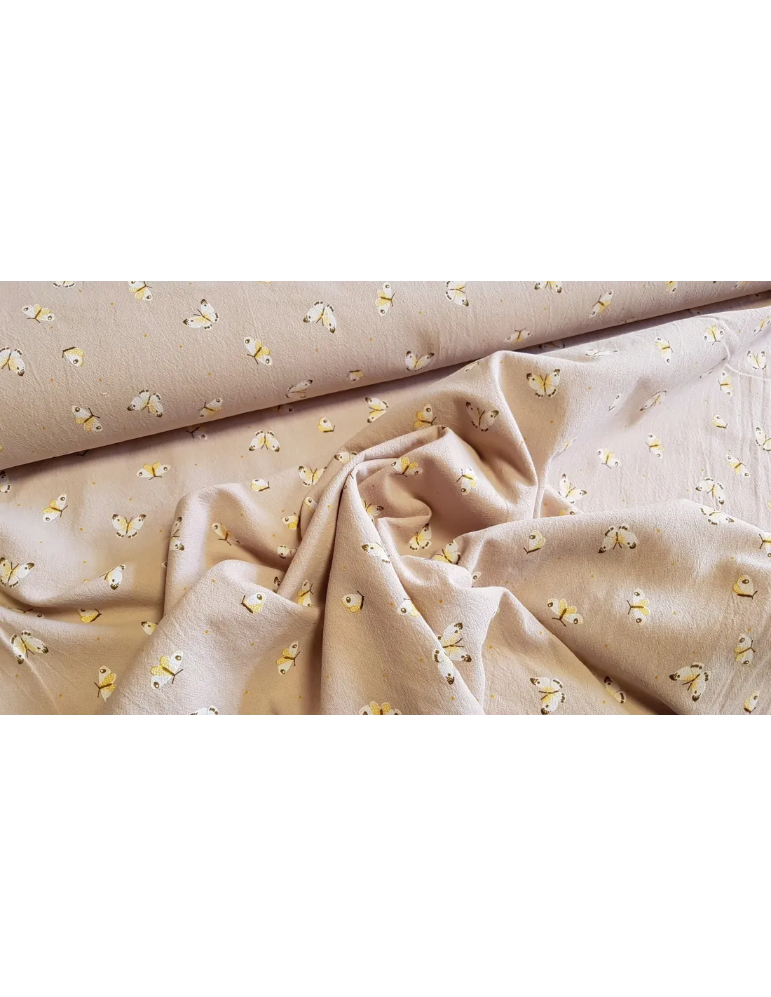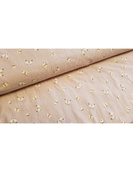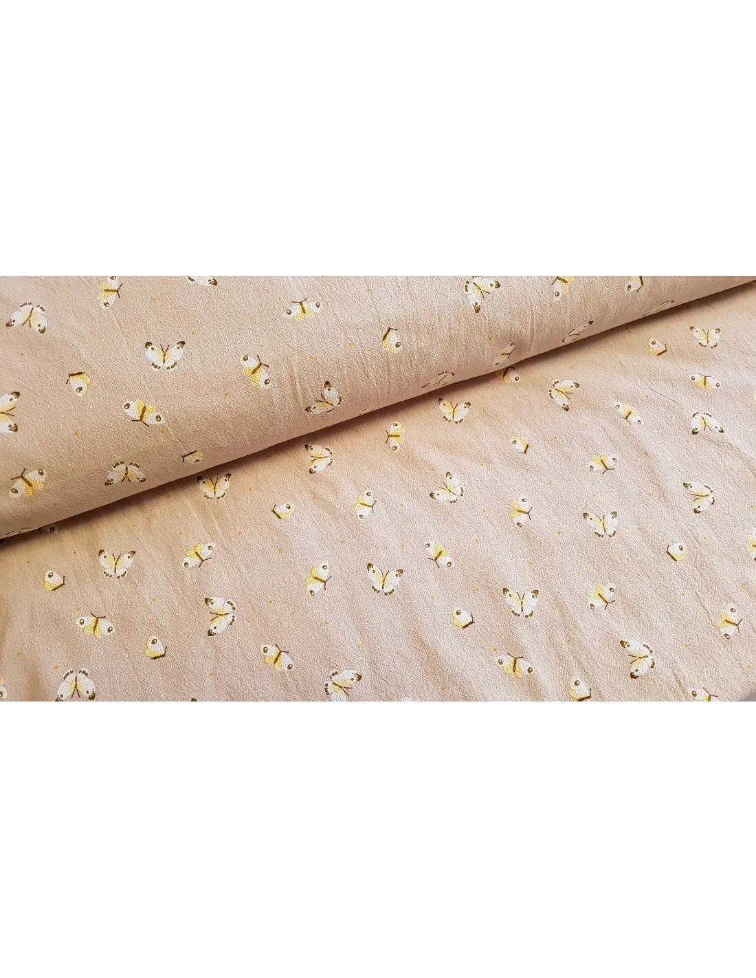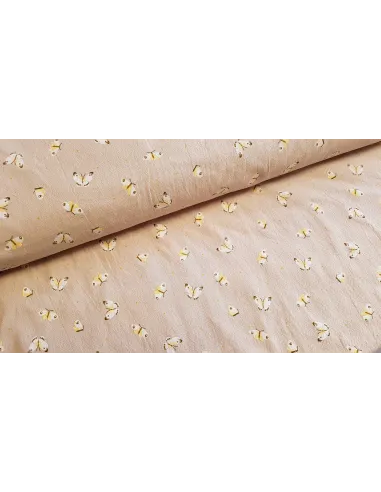 Beau tissu coton à imprimés papillons sur fond sable. Ce tissu "lavé" possède un aspect légèrement froissé qui ressemble au lin