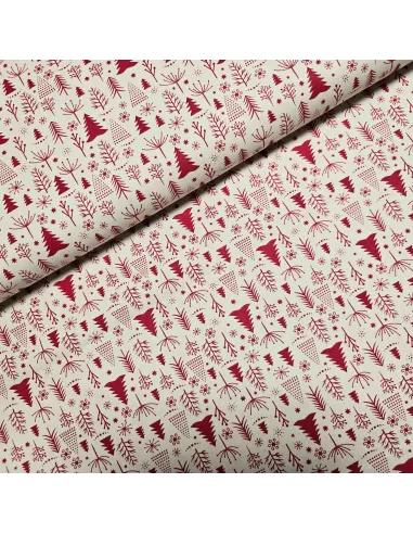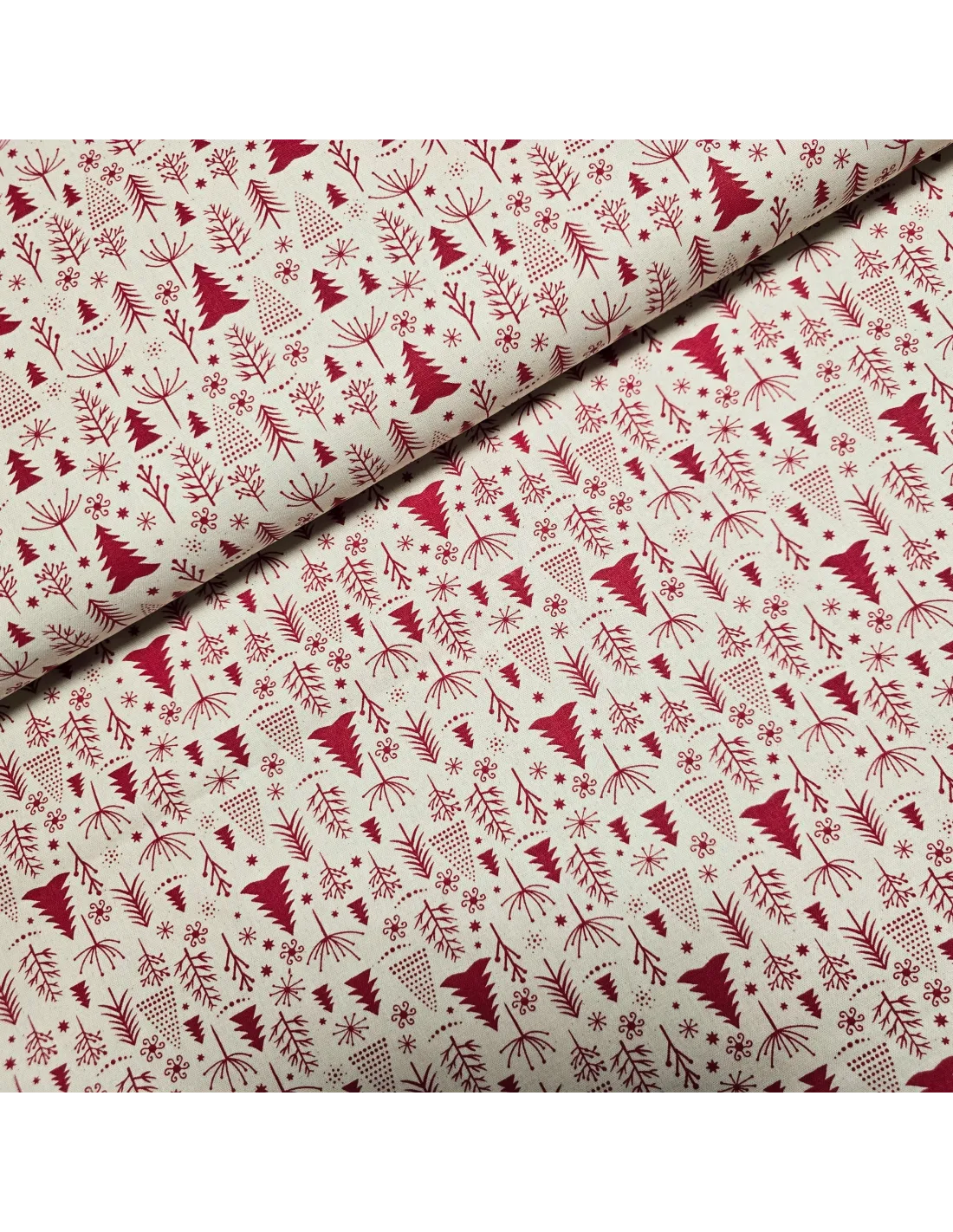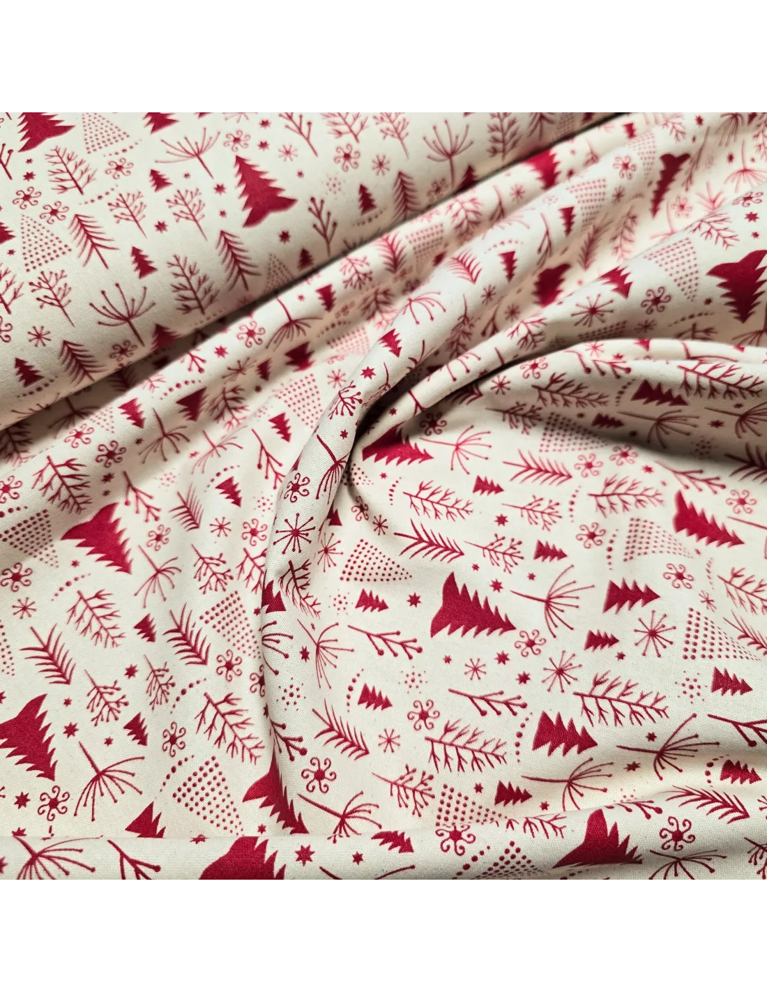 Coton de noël aux motifs sapins rouges sur fond écru.