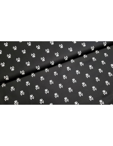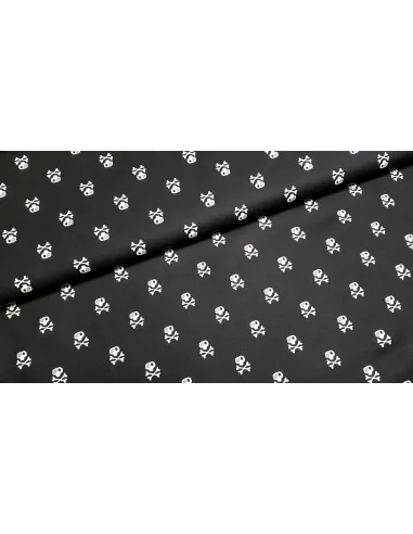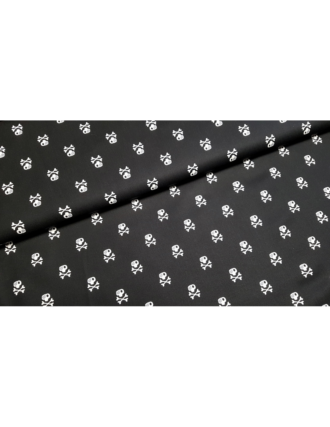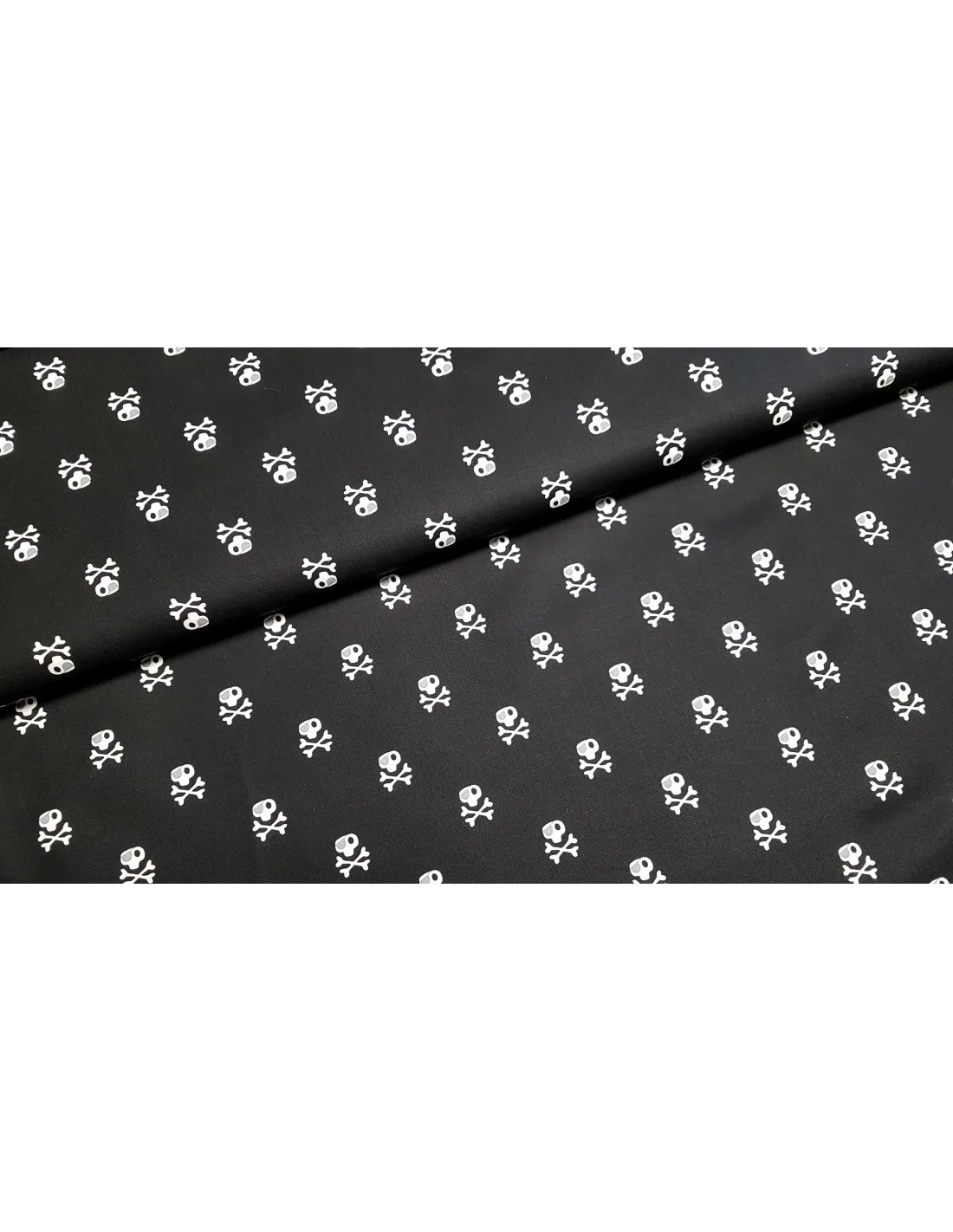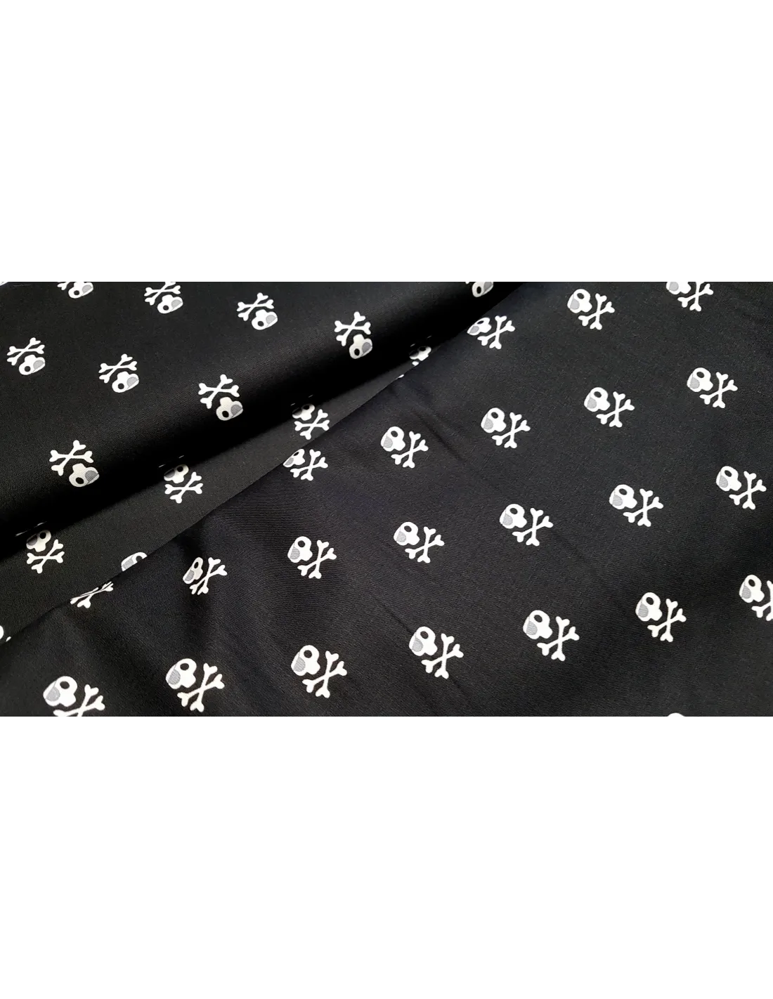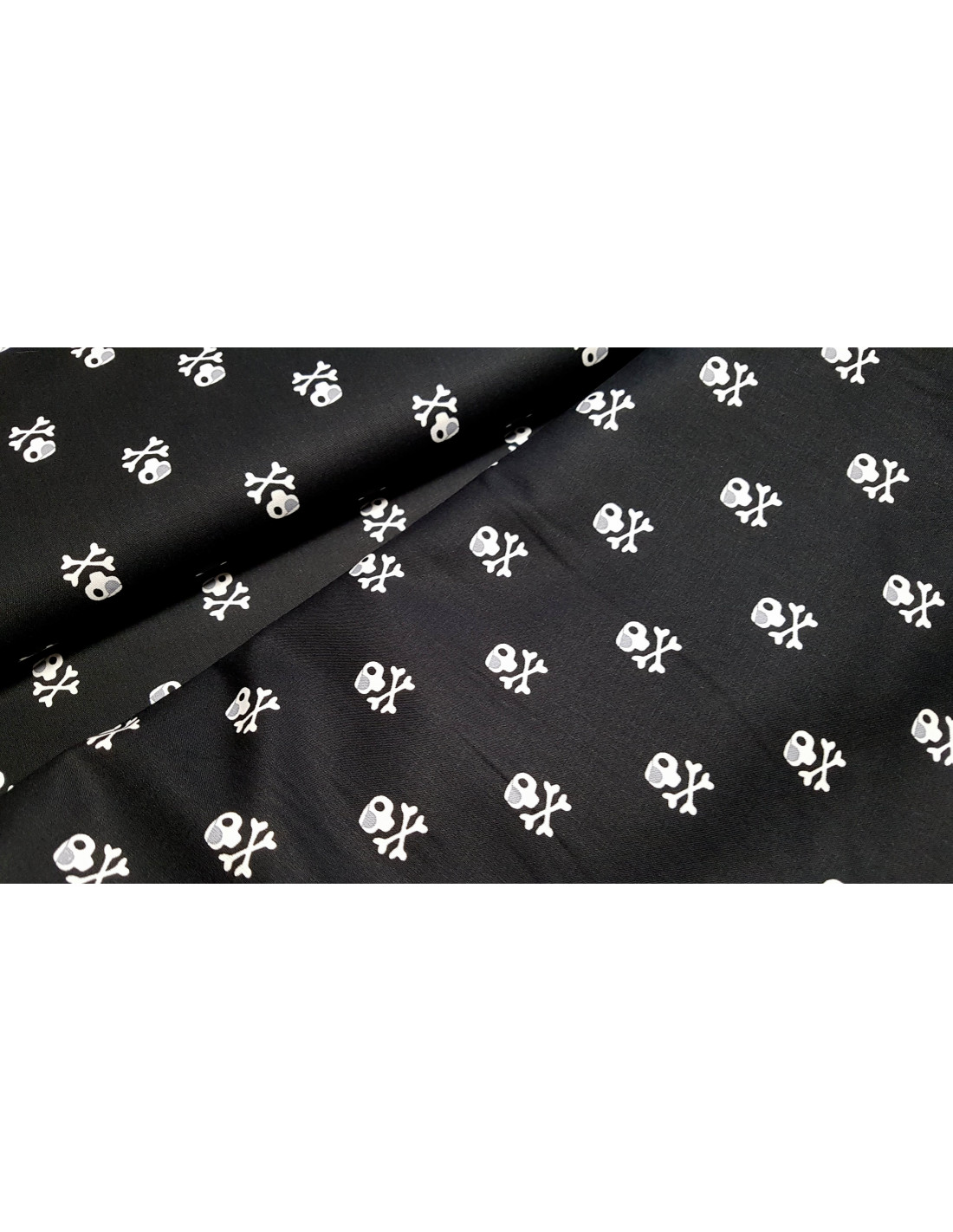 Popeline de coton à imprimés têtes de morts pirates blanches sur fond noir.