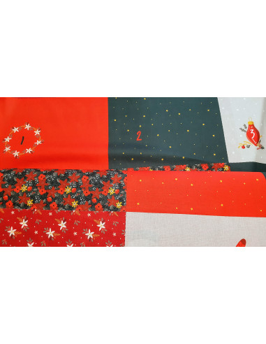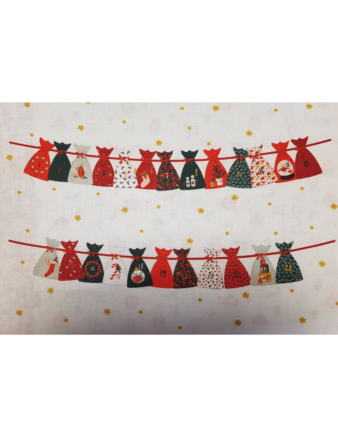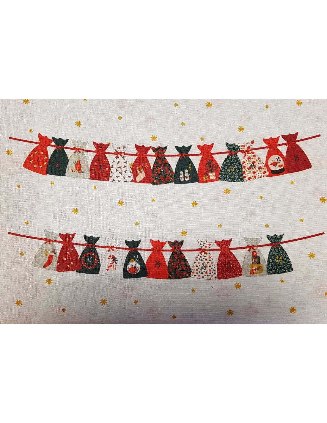 Popeline de coton calendrier de l'avant sous forme de mini baluchons. Attention, se tissu spécial se vend par panneaux de 1m
