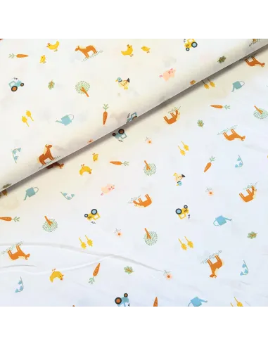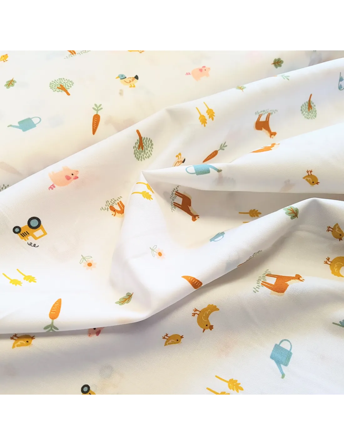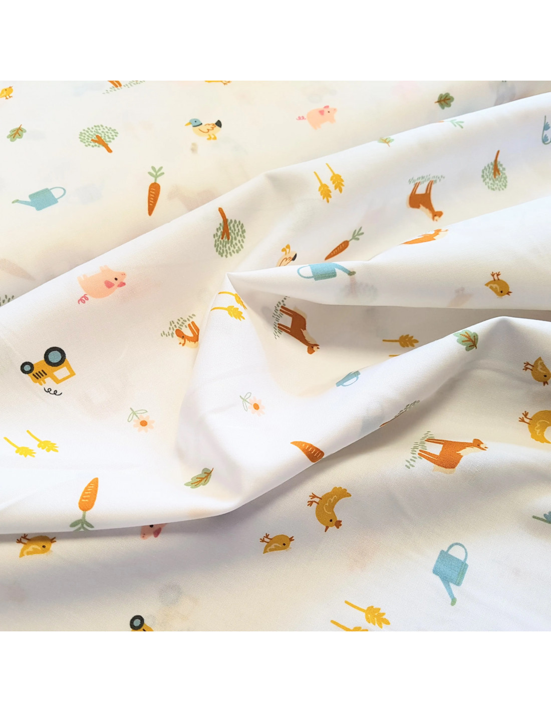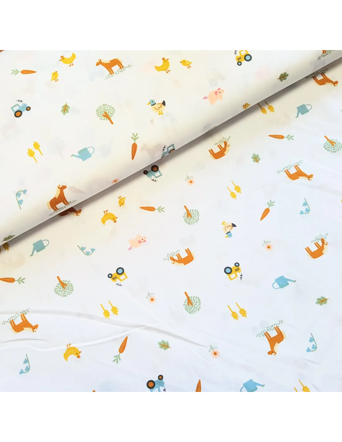 Popeline de coton avec animaux et tracteurs de la ferme, sur fond blanc.
