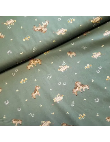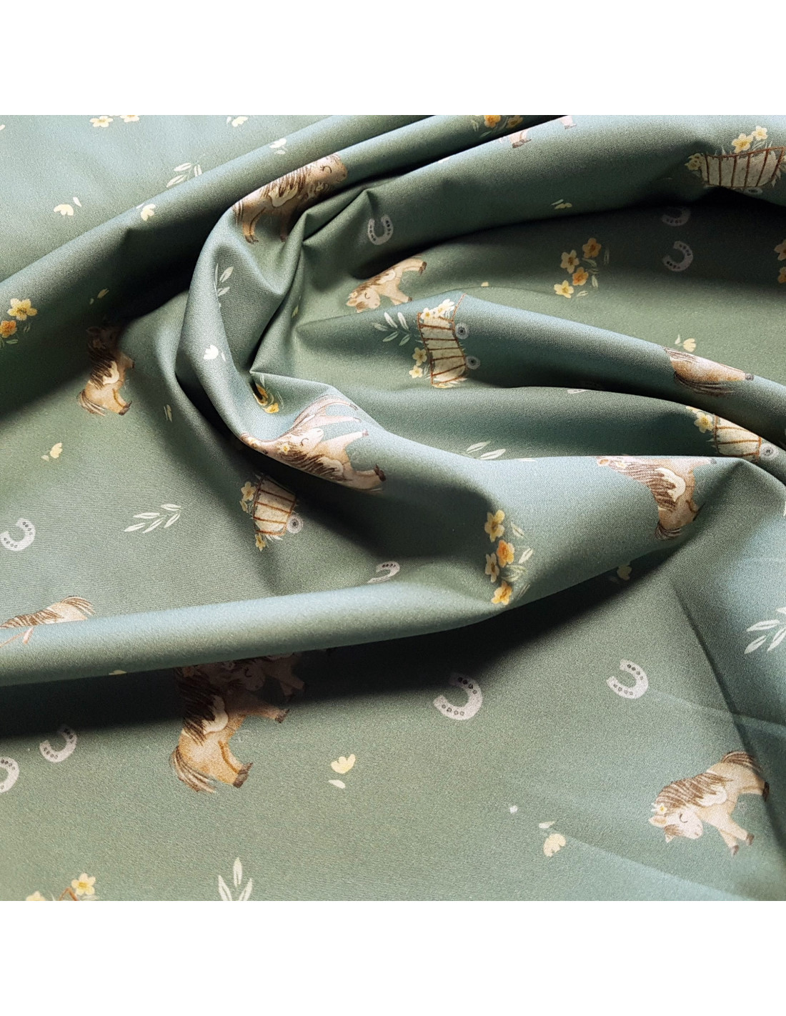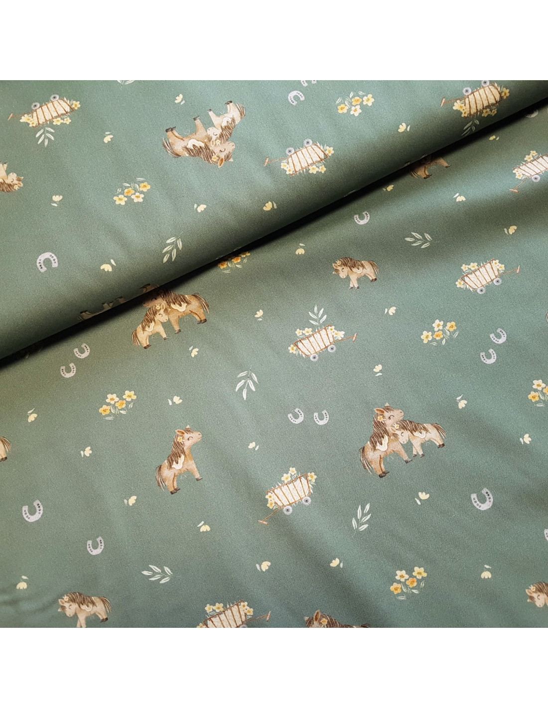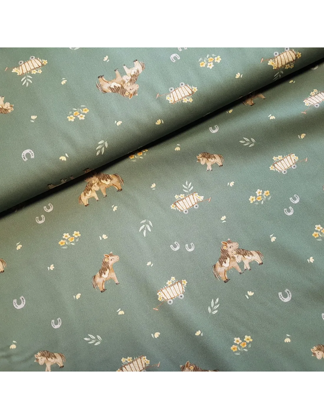 Popeline de coton, impression digitale, petits poneys sur fond vert sauge.