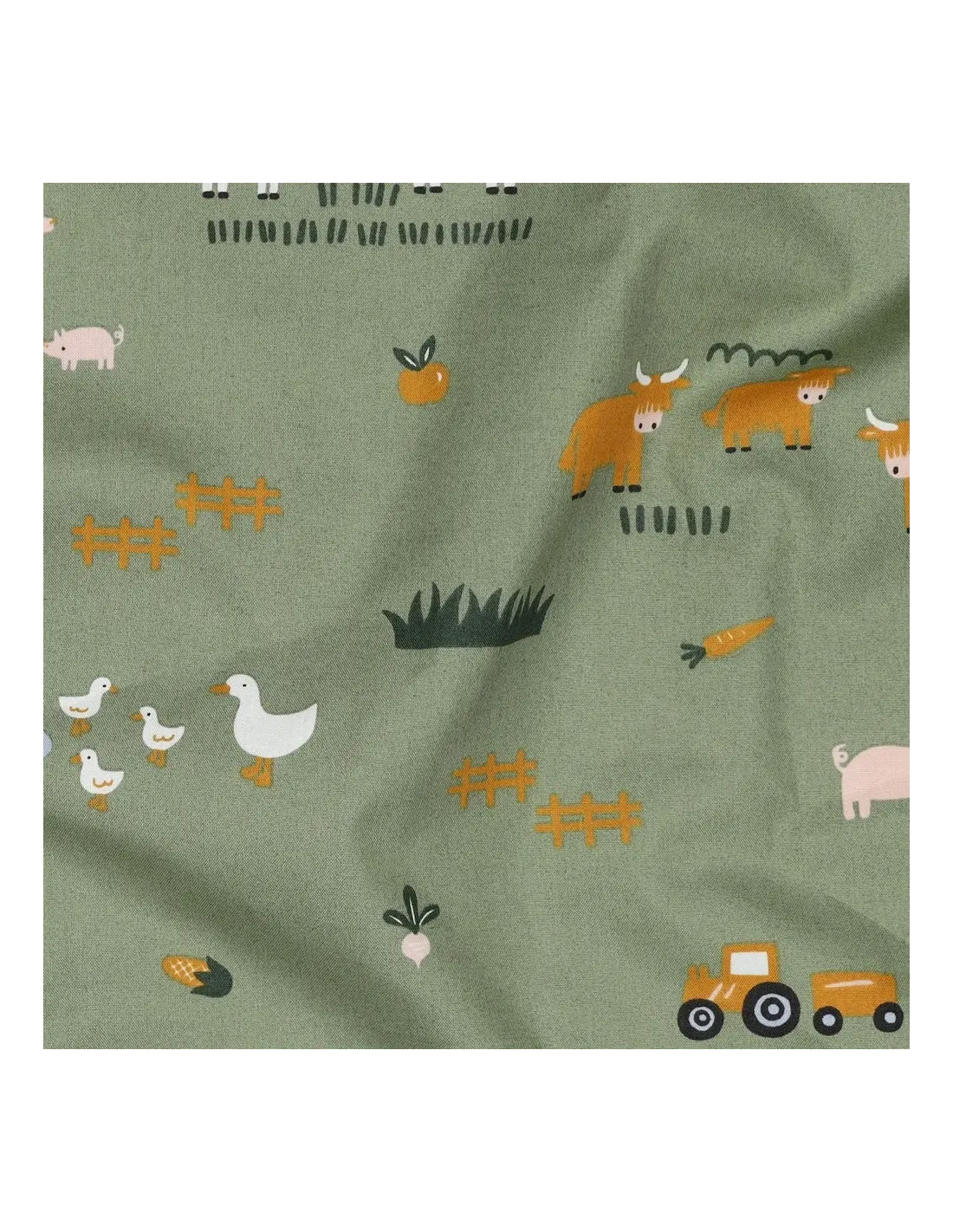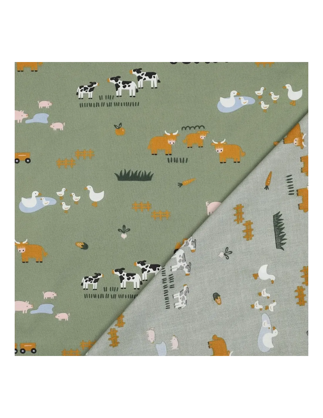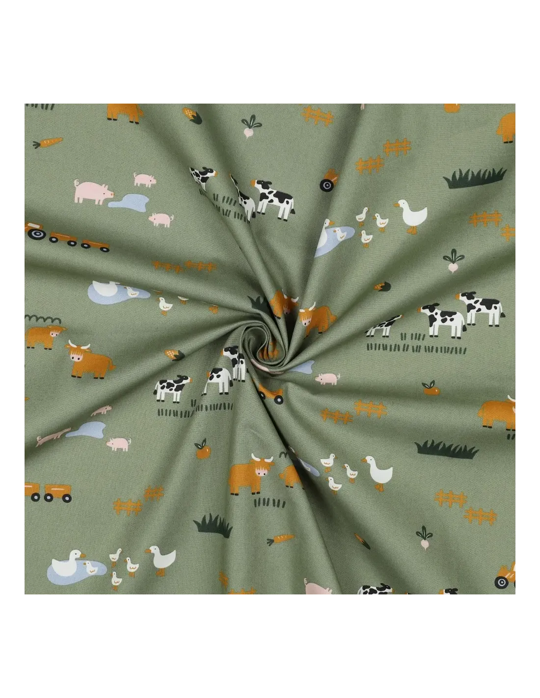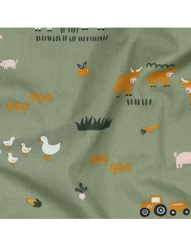 Plongez dans l'univers bucolique de la ferme avec cette popeline de coton ludique et pleine de douceur. Sur un fond vert tendre qui évoque les prairies, des animaux de la ferme et des éléments de la campagne sont représentés avec un style enfantin : des vaches, des canards, des cochons, des tracteurs... Un motif idéal pour stimuler l'imagination des petits.