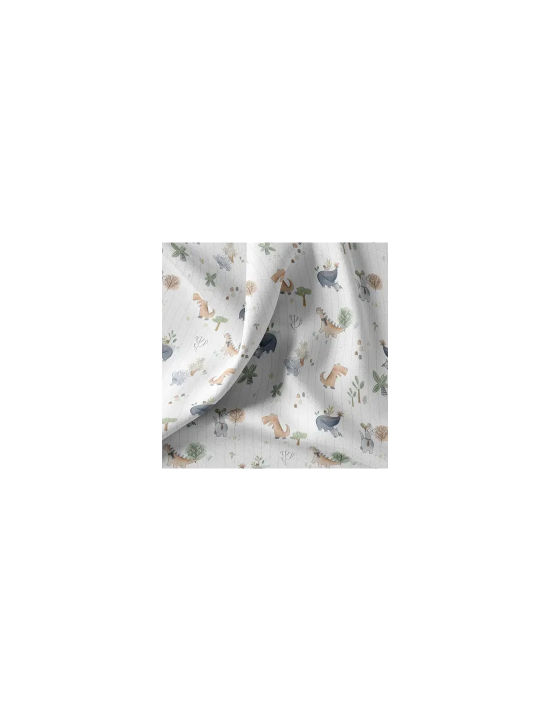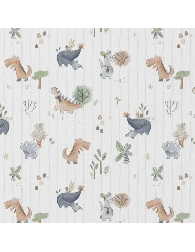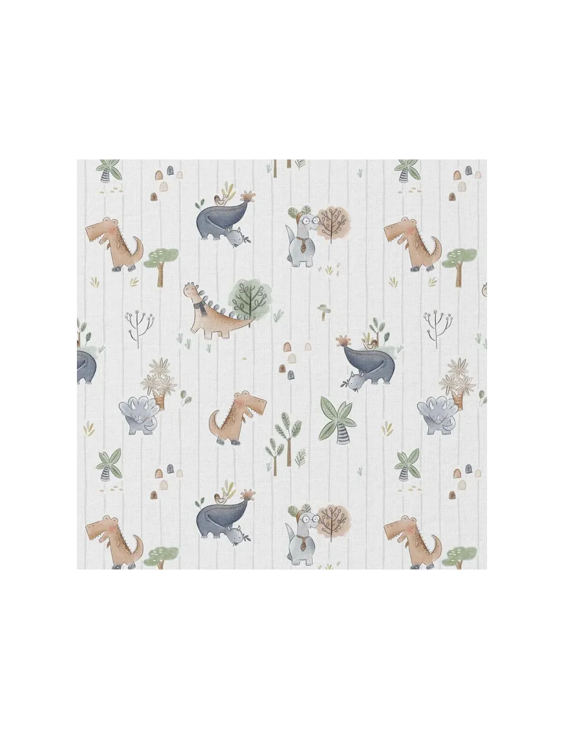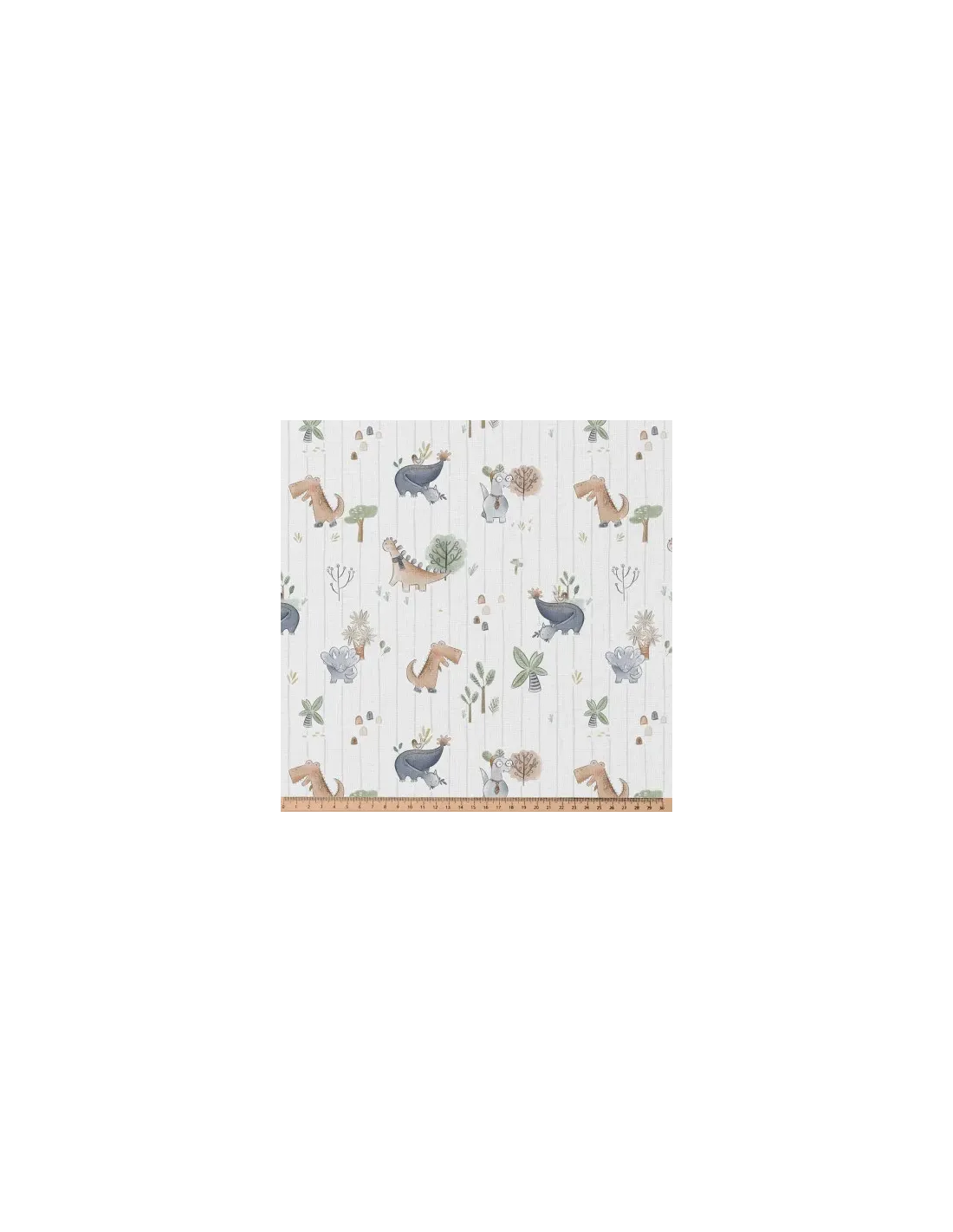 Préparez-vous à une aventure préhistorique toute douce avec notre Popeline de Coton au motif Dinosaures ! Ce tissu est parfait pour les petits explorateurs. Les dinosaures sont illustrés avec un style aquarelle ludique et amical, dans des tons pastel de bleu, rouille et vert, sur un fond clair et légèrement texturé.