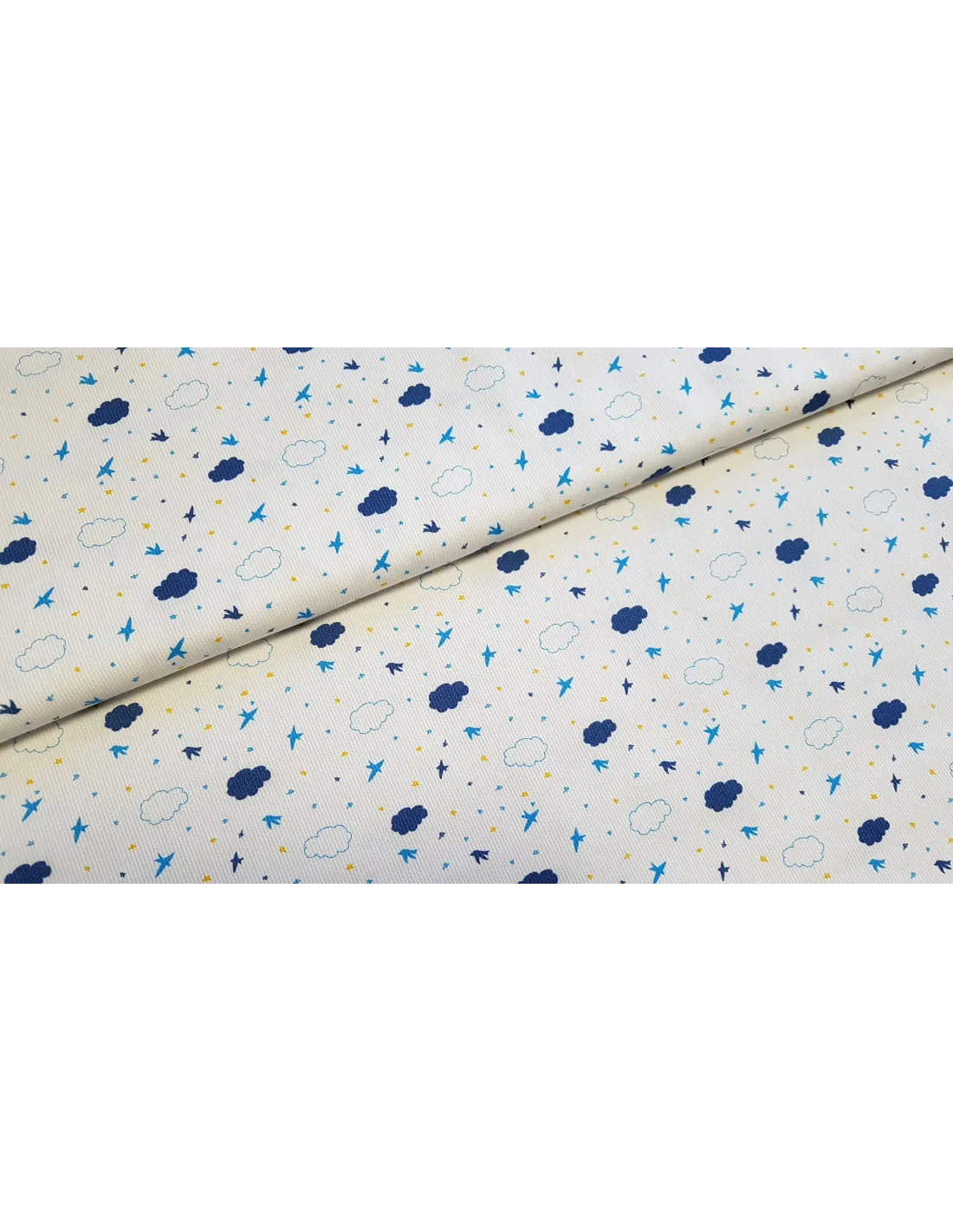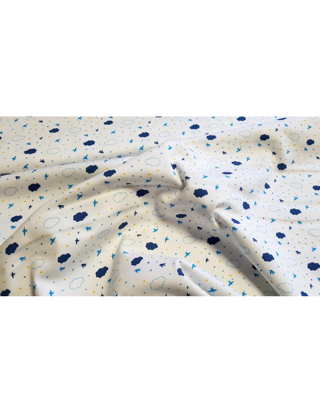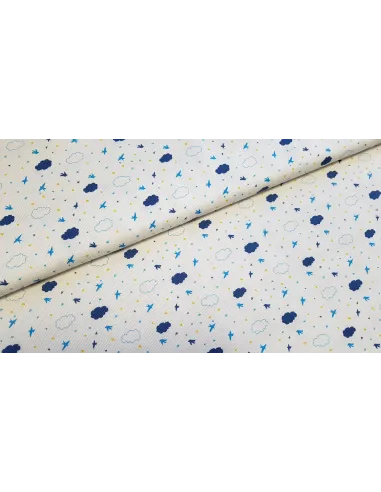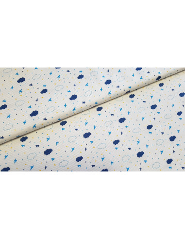 Piqué de coton aux motifs oiseaux et nuages sur fond blanc. Ce tissu est un peu plus épais qu'une popeline ce qui lui confère une bonne tenue.