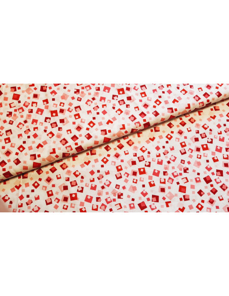 Popeline de coton à carrés roses et rouges sur fond blanc.