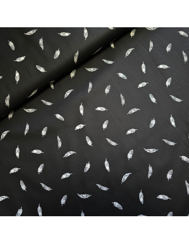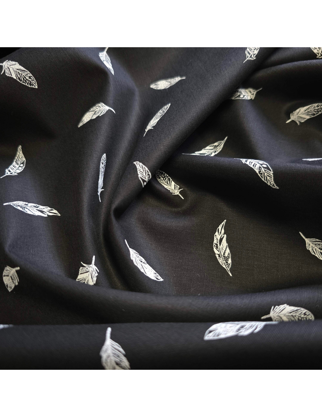 Popeline de coton imprimée plumes blanches sur fond noir.