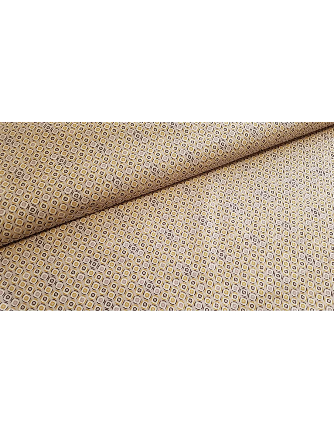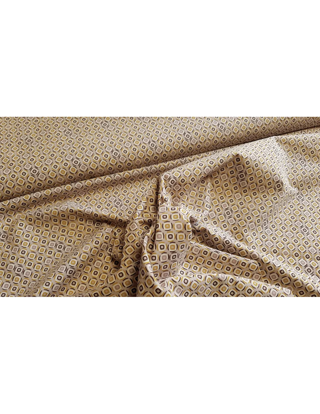 Cretonne de coton à imprimés losanges colorés sur fond parme. Ce tissu est plus épais qu'une popeline.