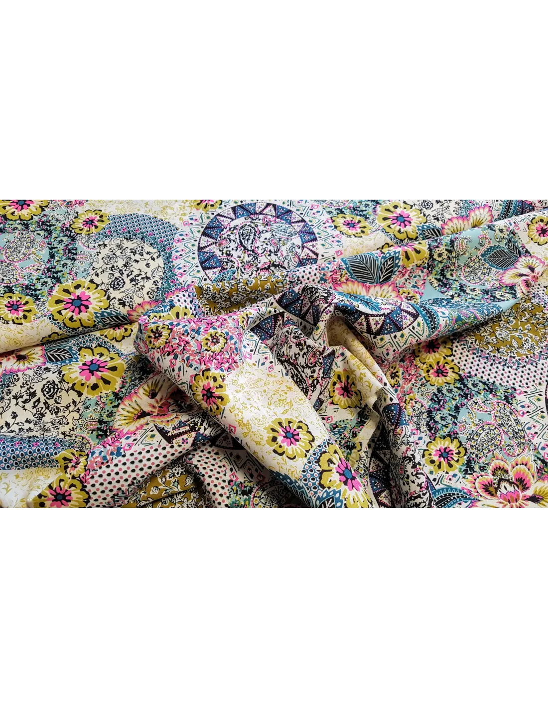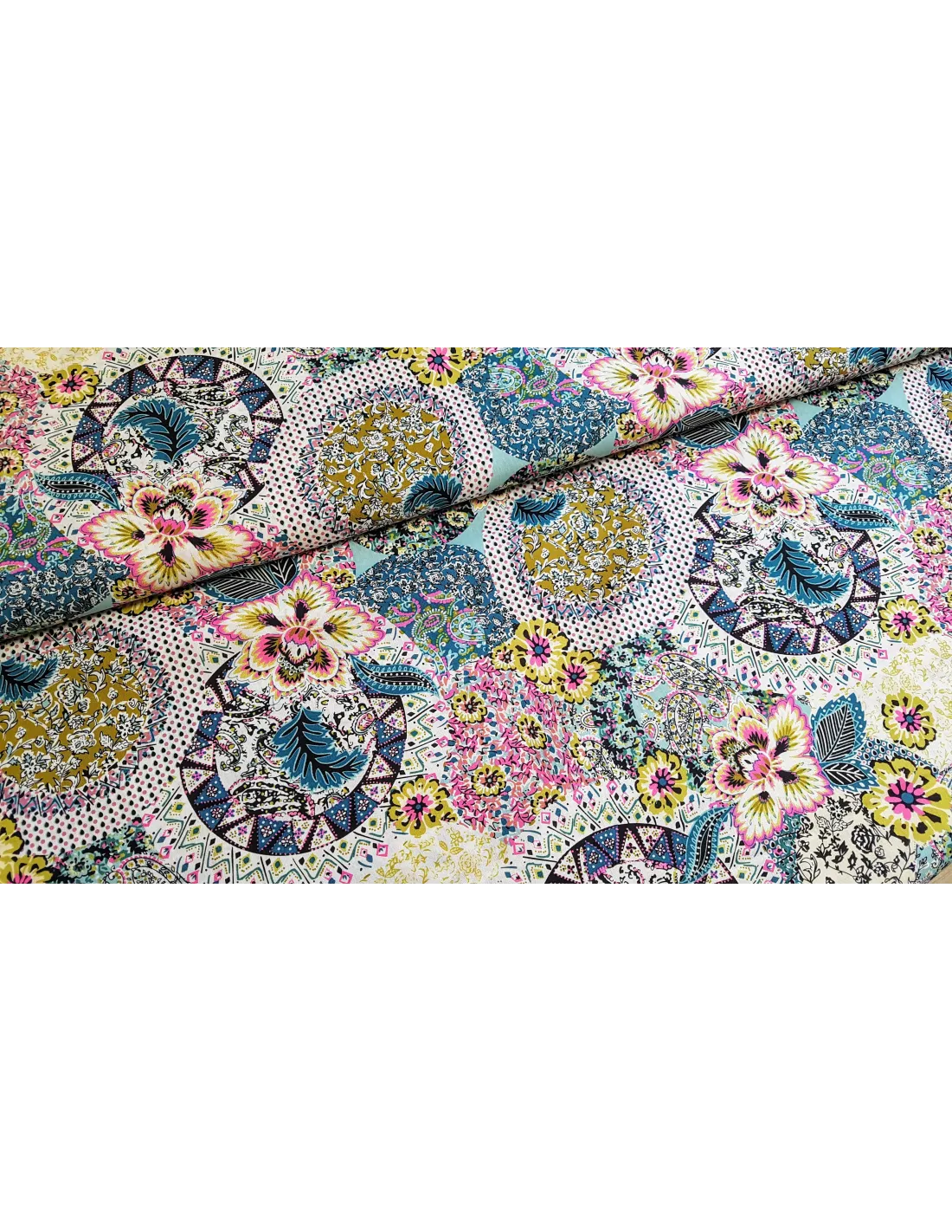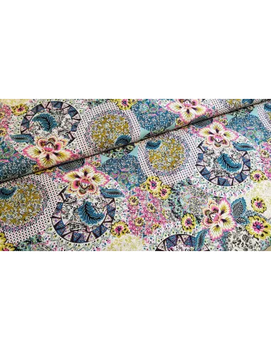 Popeline de coton à impression fleurie, multicolore sur fond blanc. Ce tissu de haute qualité a un touché extrêmement doux.
