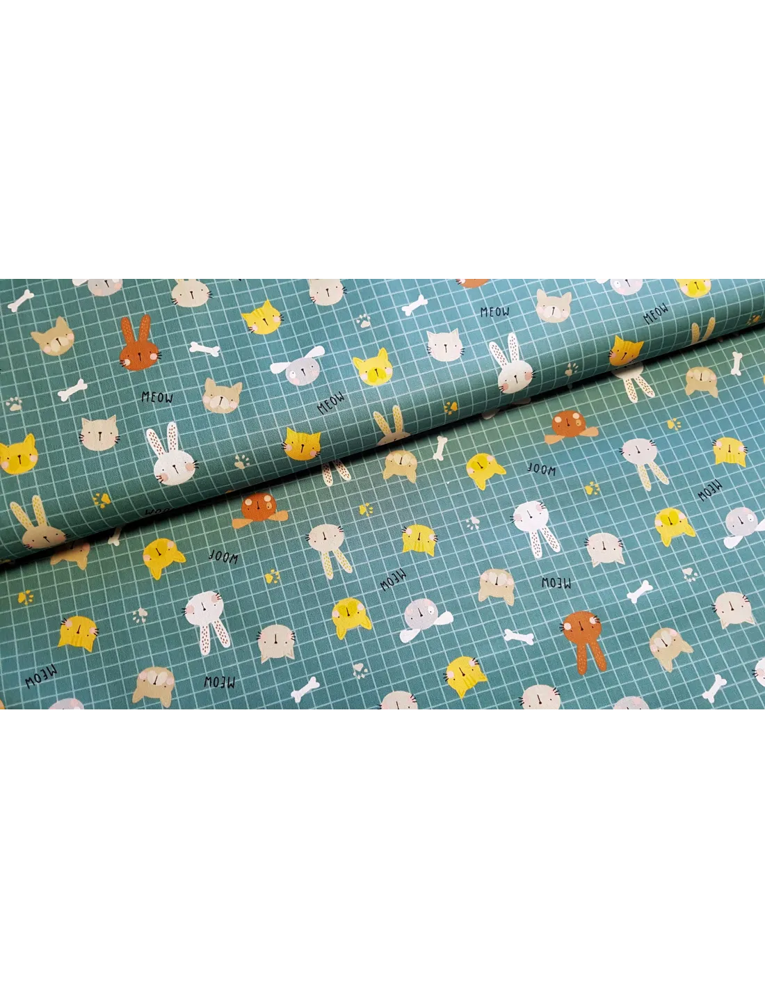 Popeline de coton à imprimés cris d'animaux sur fond vert émeraude.