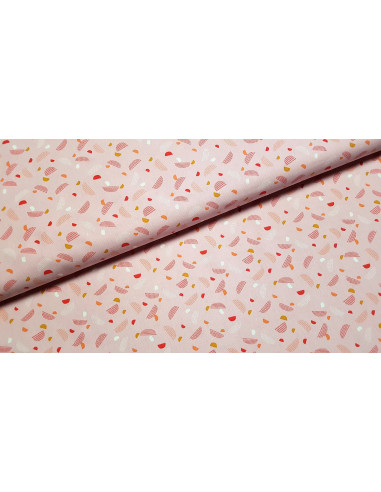 Cretonne de coton aux imprimés demi lunes sur fond rose. Ce tissu est un peu plus épais qu'une popeline.