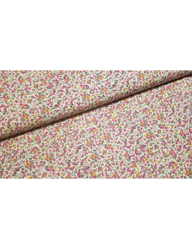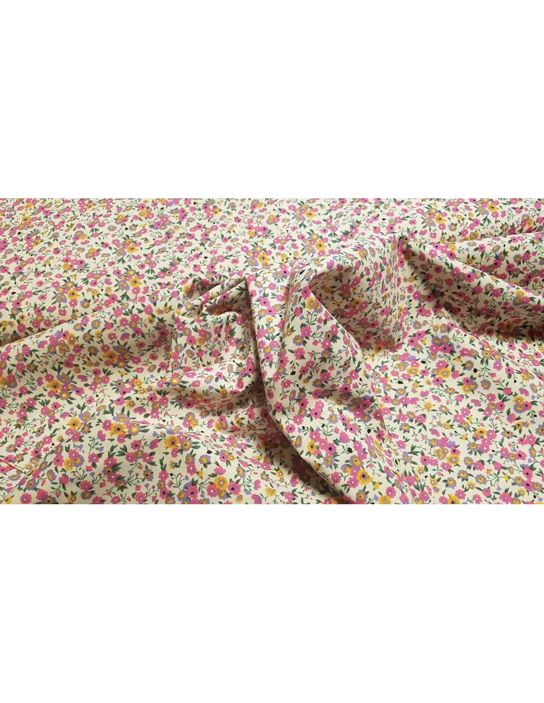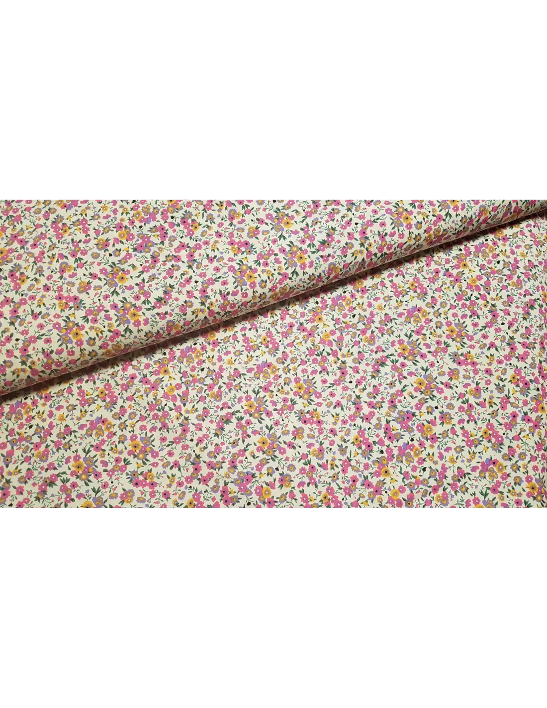 Popeline de coton à imprimés petites fleurs colorées sur fond beige.