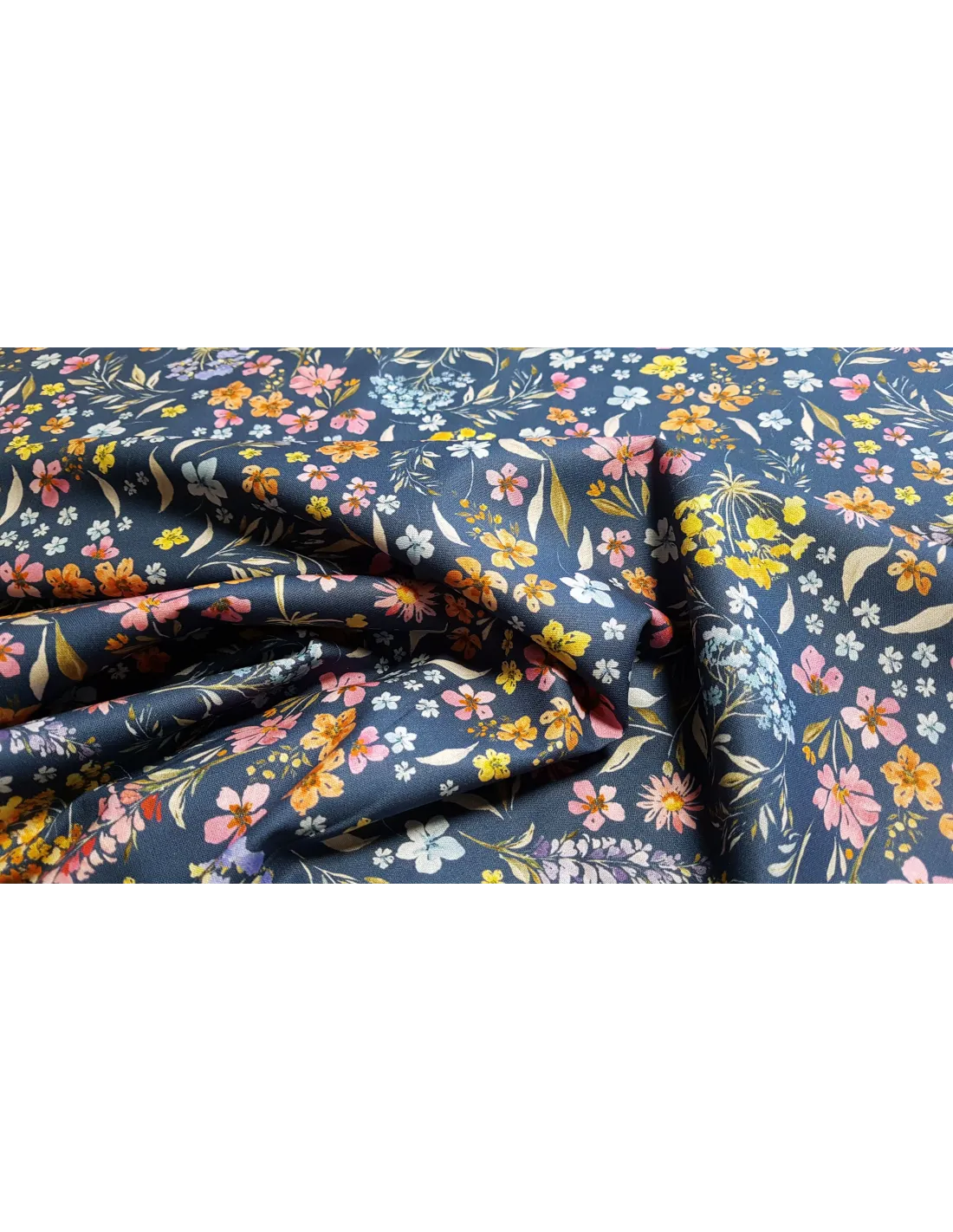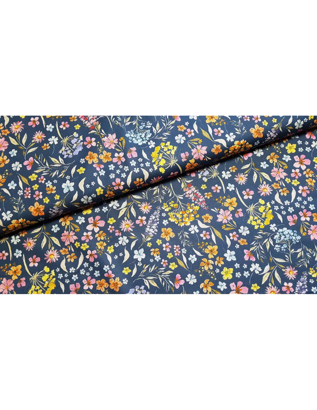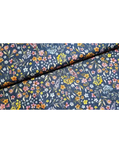 Popeline de coton, fleurs colorées sur fond bleu jean