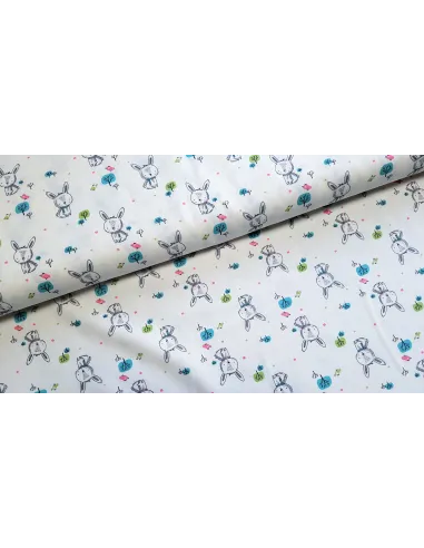 Cretonne de coton aux motifs lapins. Ce tissu est un peu plus épais qu'une popeline.