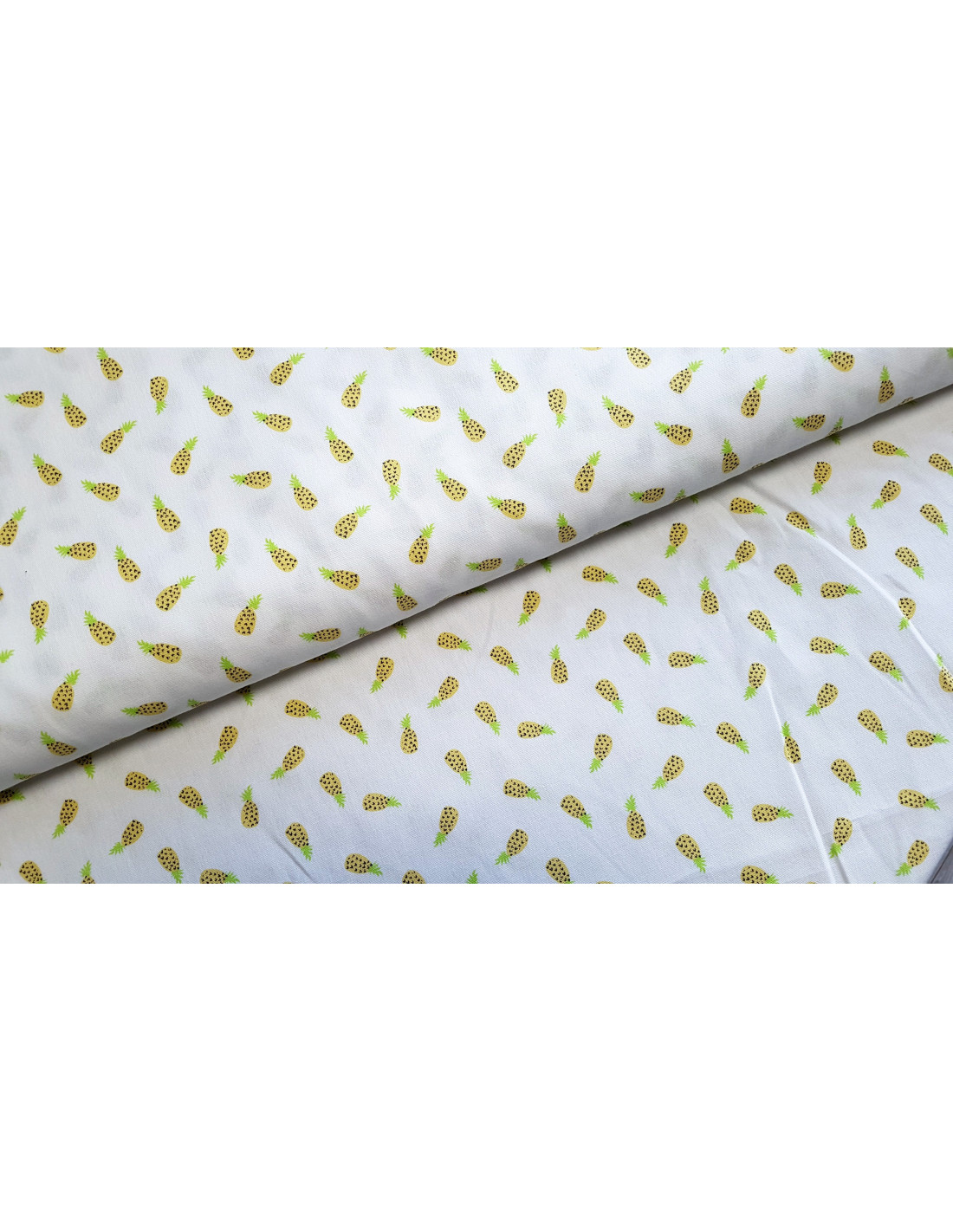 Cretonne de coton aux motifs ananas jaunes fond blanc. Ce tissu est un peu plus épais qu'une popeline.