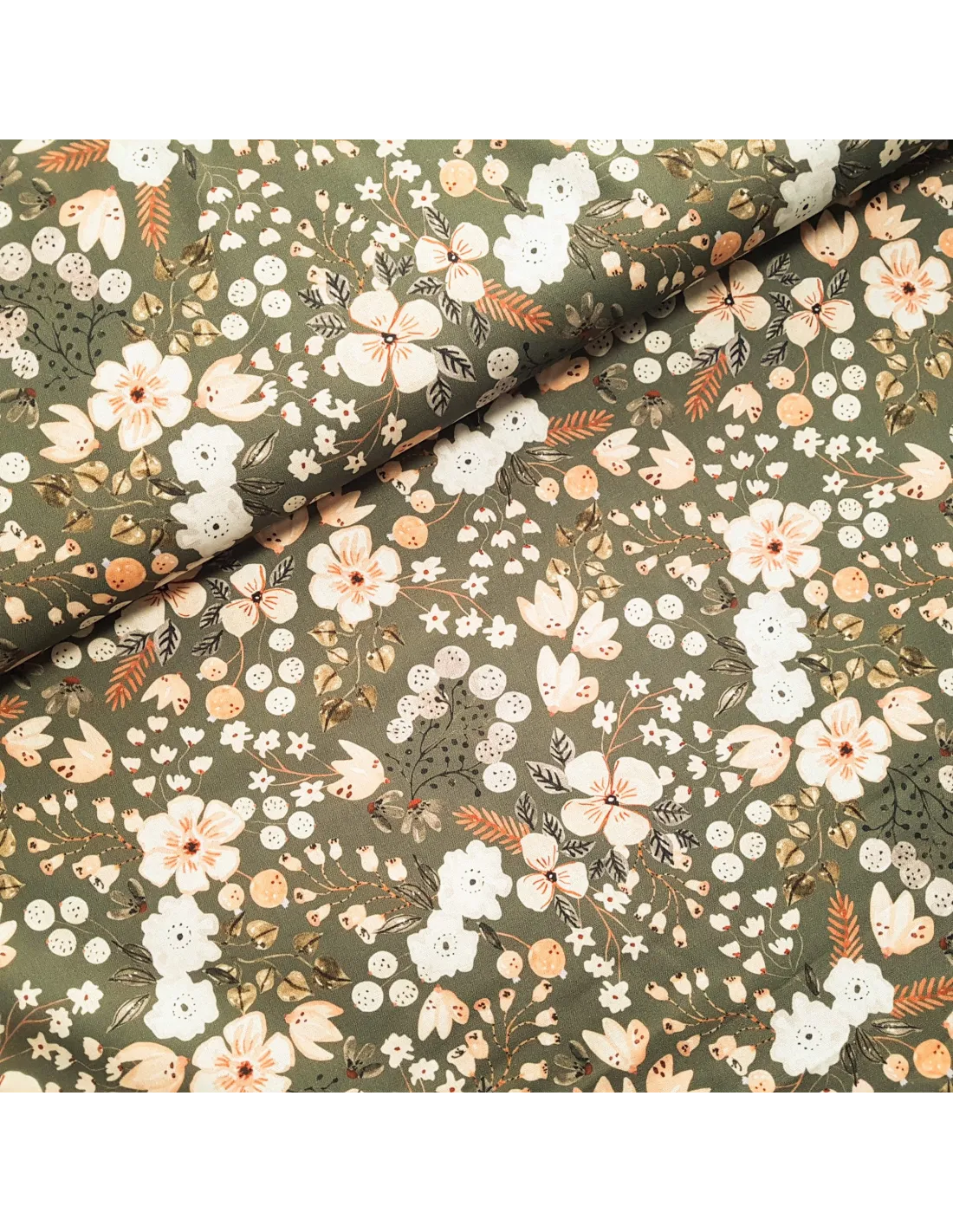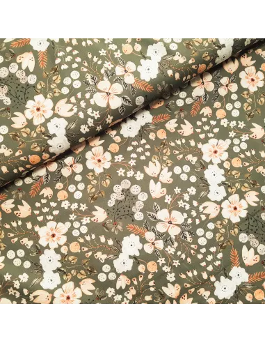 Popeline de coton fleurs sur fond kaki