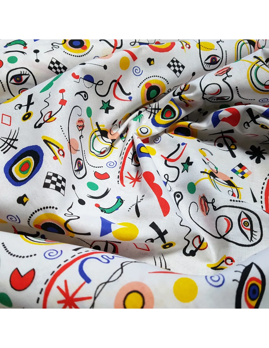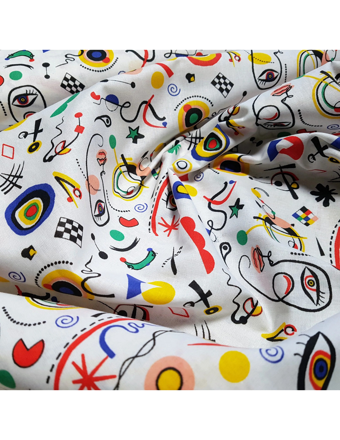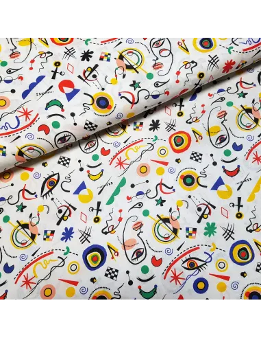 Cretonne de coton aux motifs multicolores sur fond blanc.