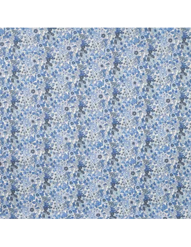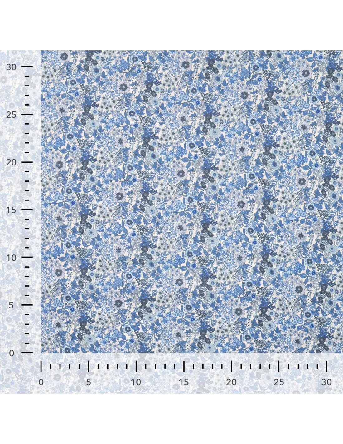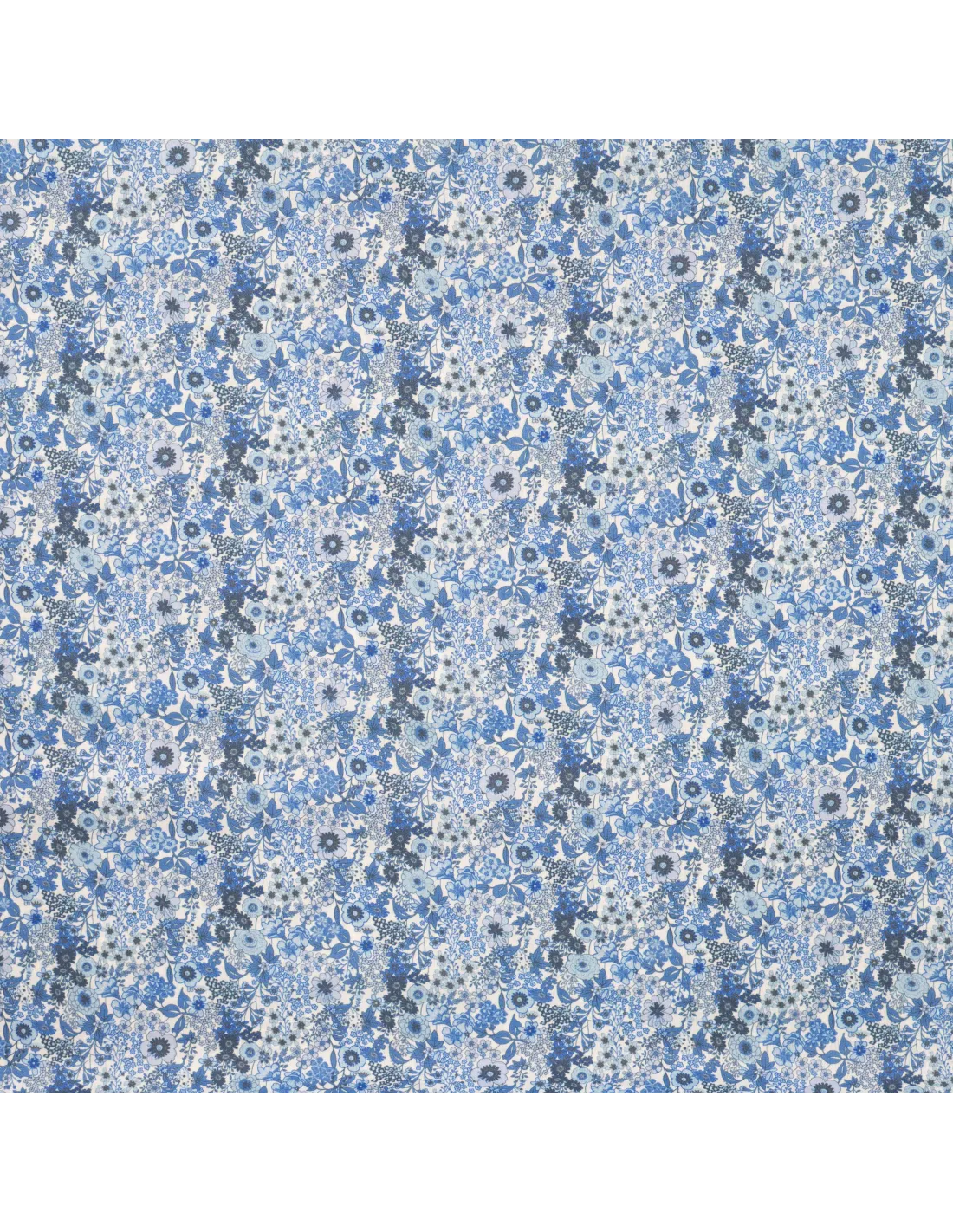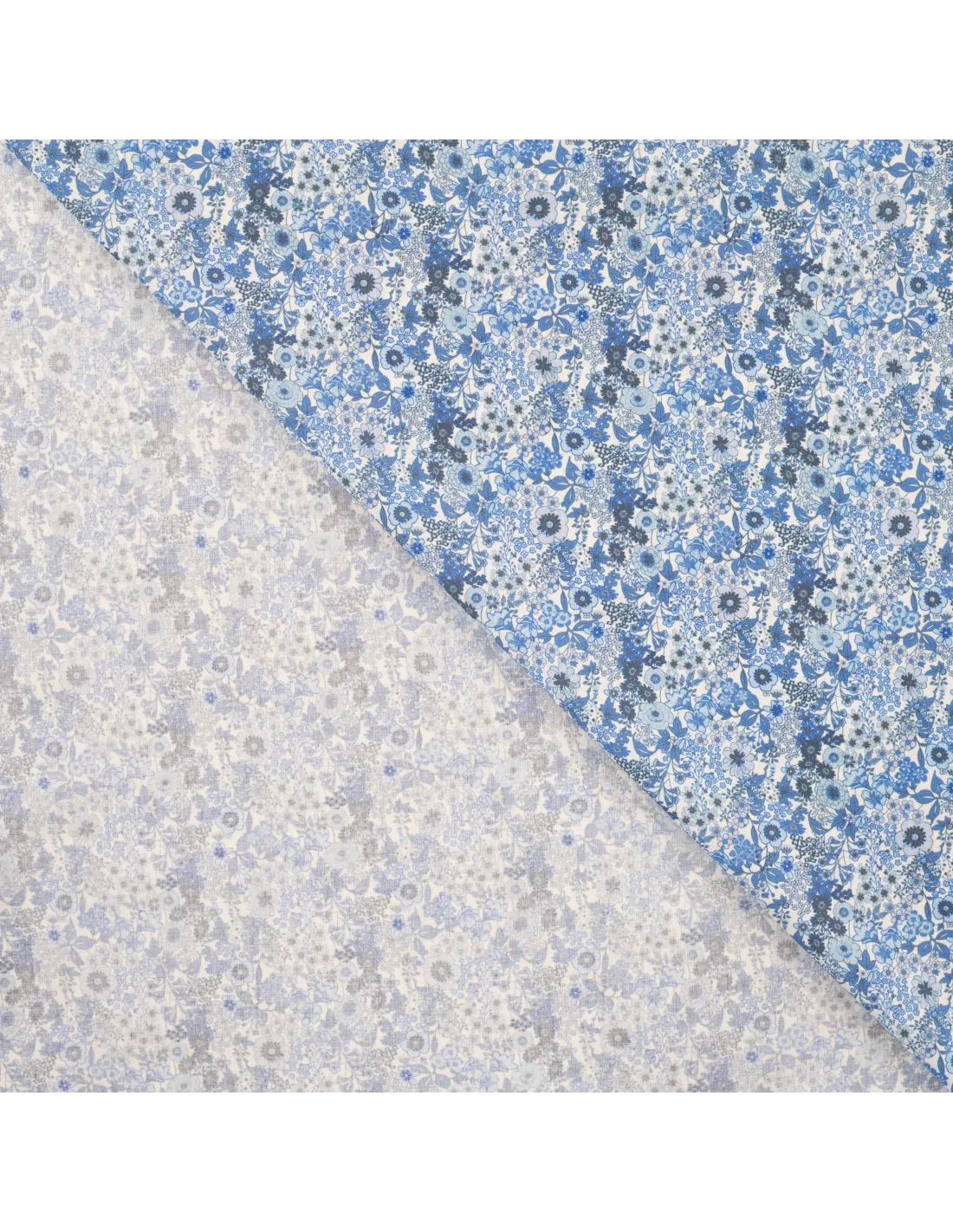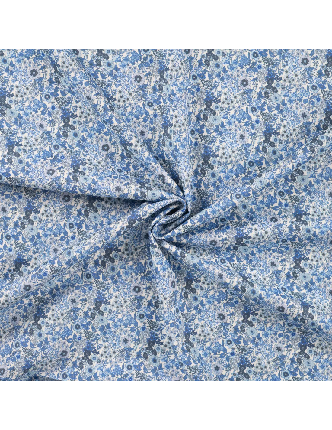 Popeline de coton à impression digitale fleurs dans les tons bleus sur fond blanc. Ce tissu de haute qualité a un toucher extrêmement doux.