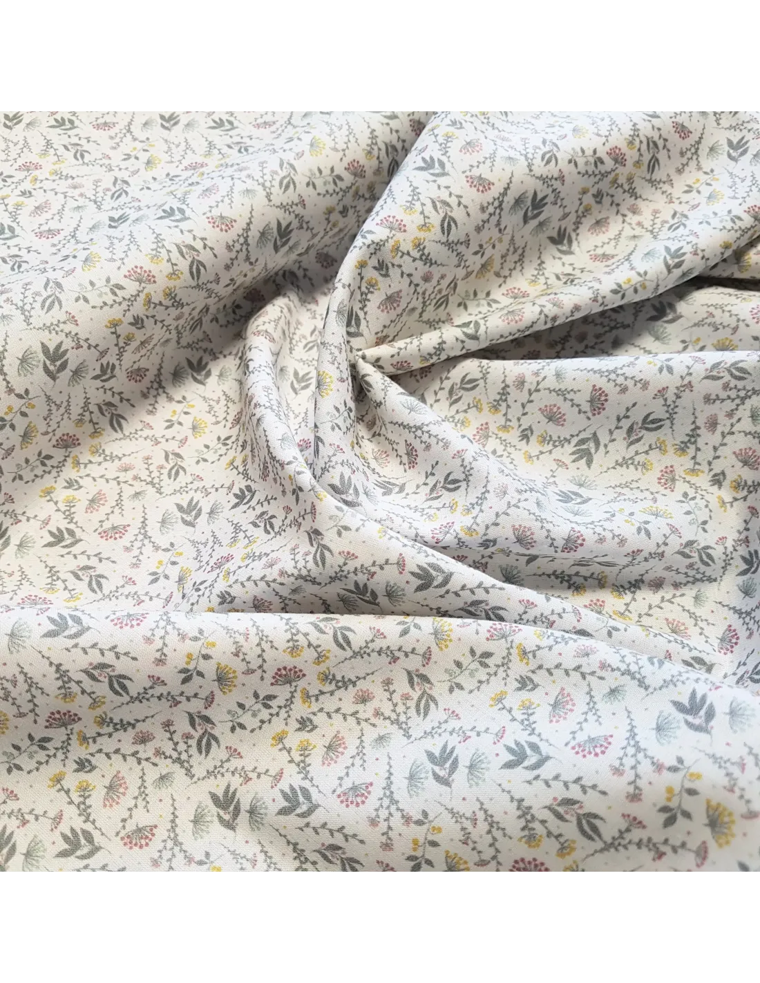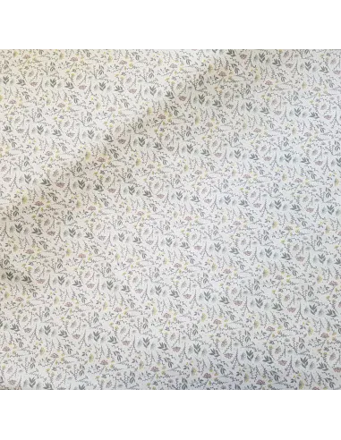 Popeline de coton à impression digitale fleurs dans les tons verts et jaunes sur fond blanc. Ce tissu de haute qualité a un toucher extrêmement doux.