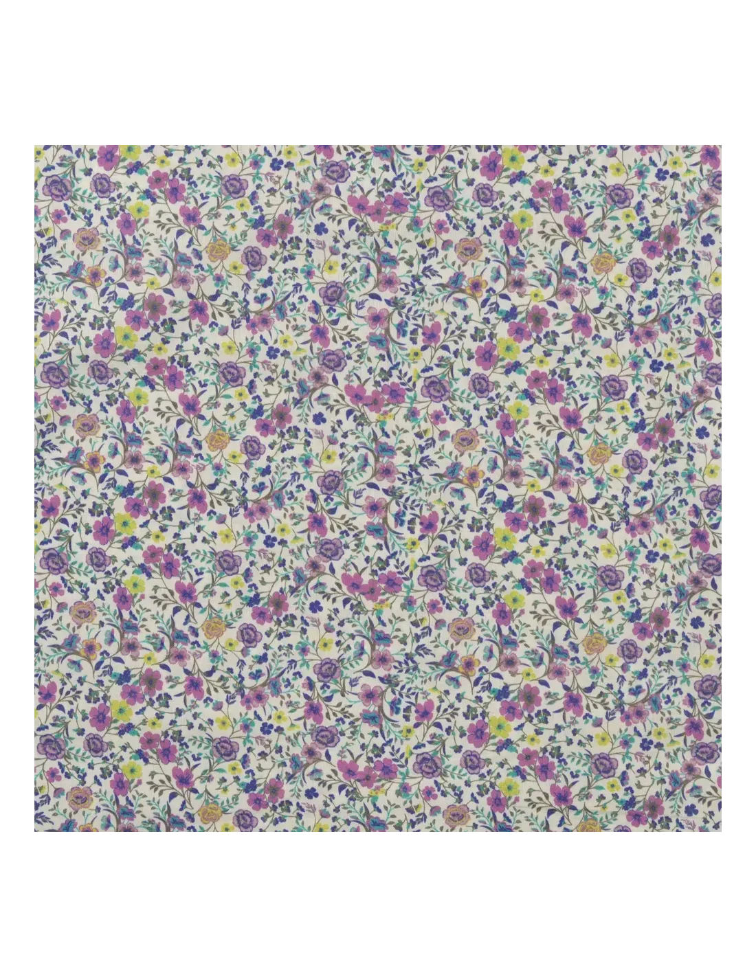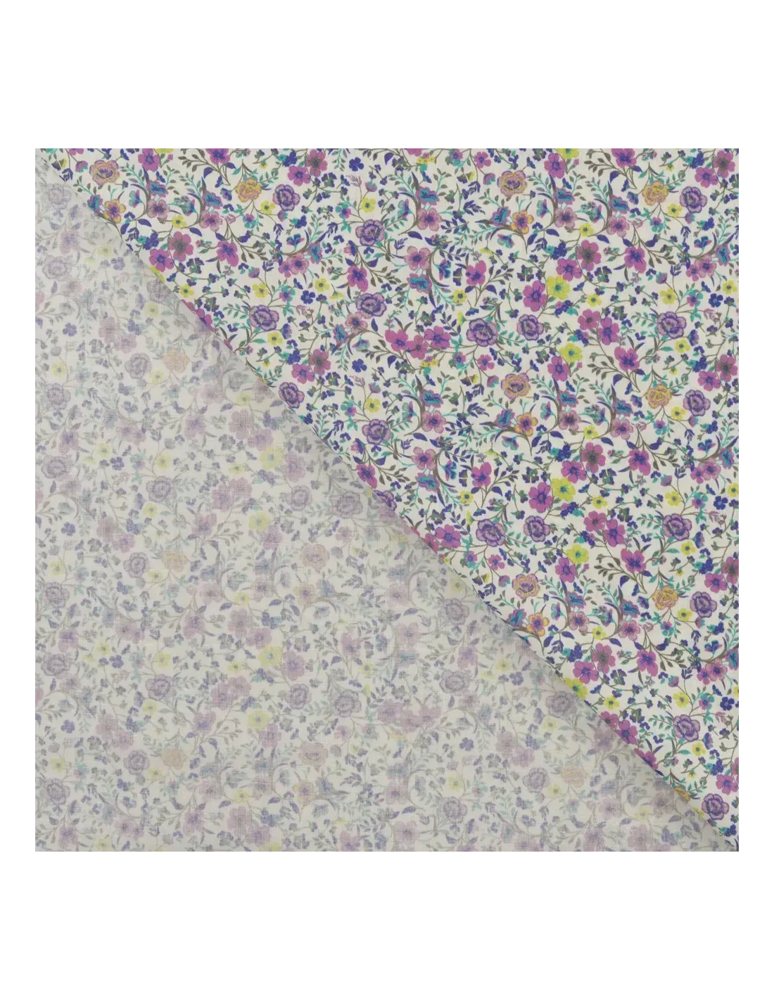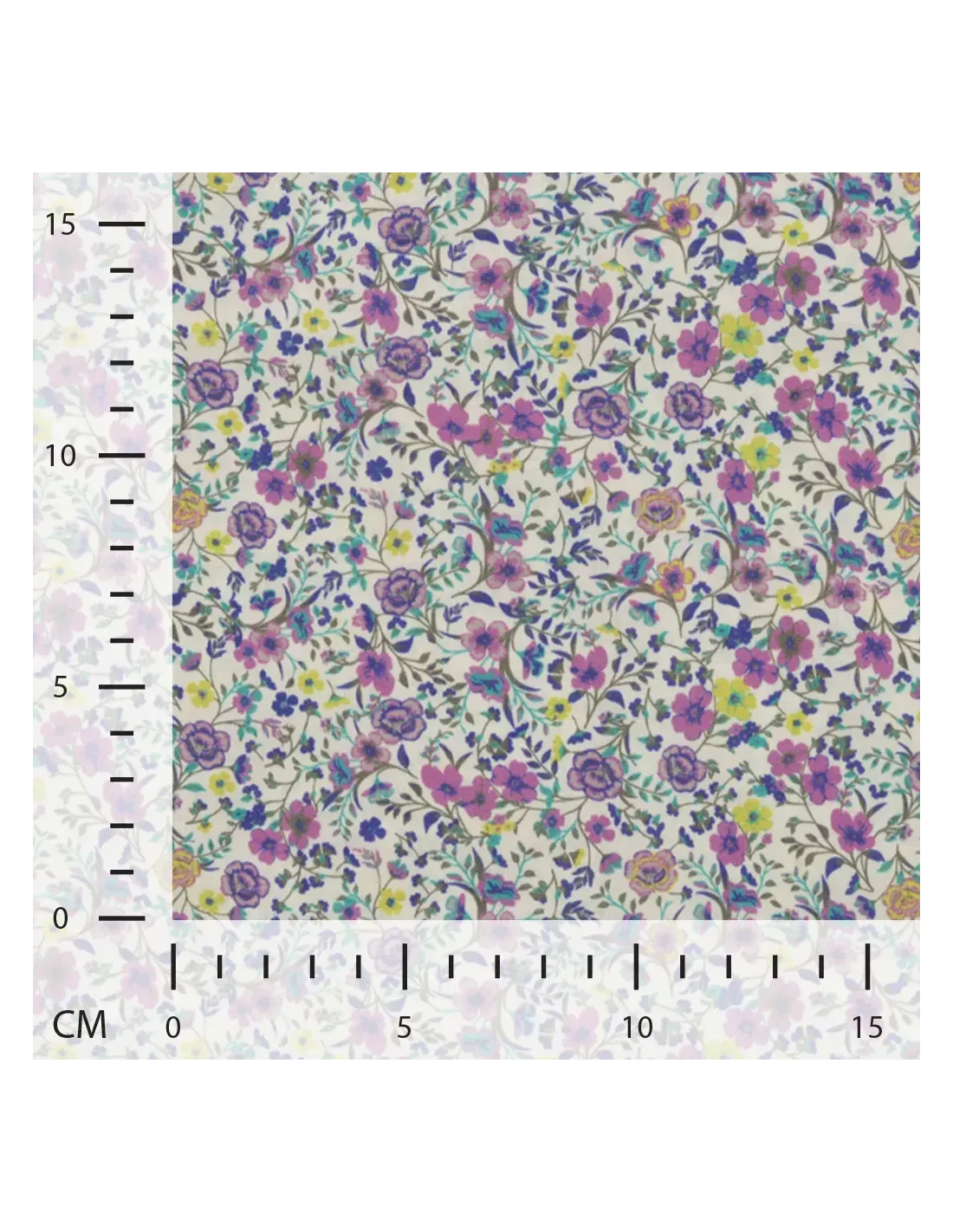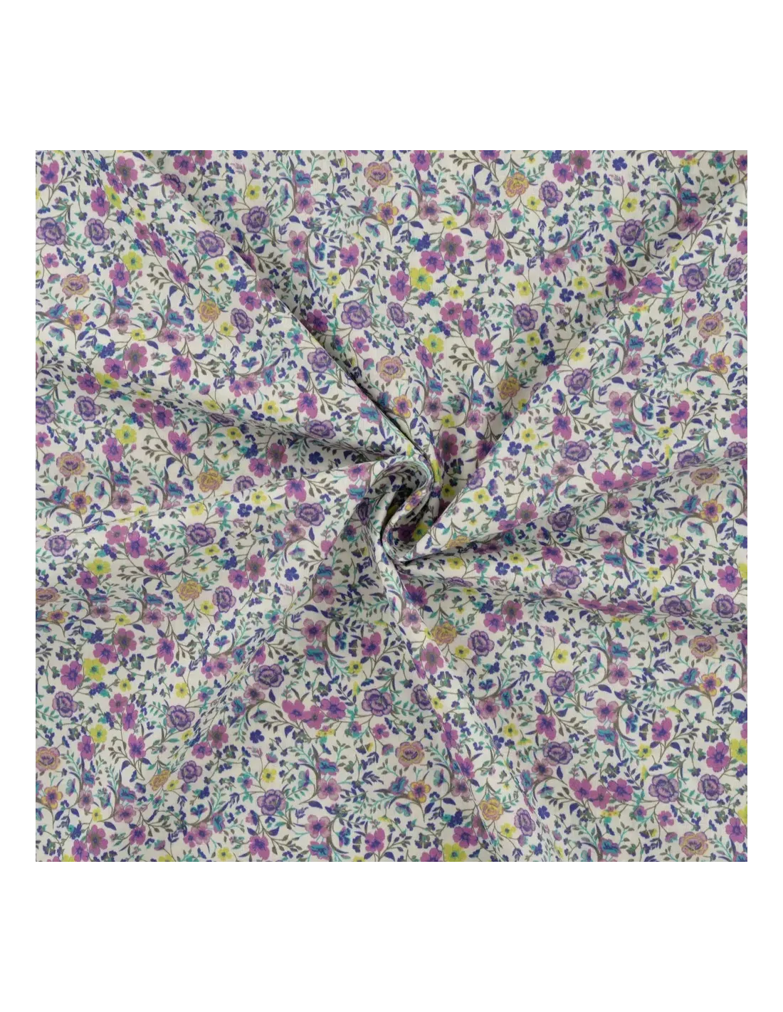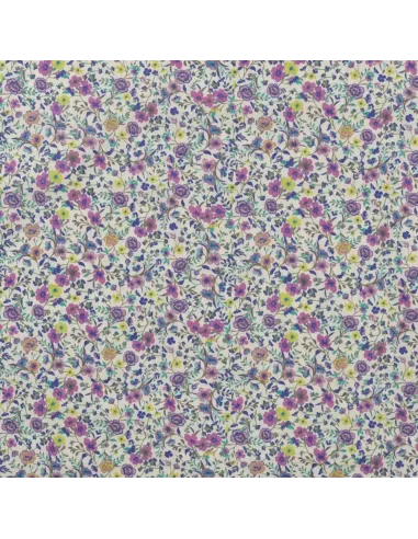 Popeline de coton à impression digitale fleurs dans les tons violets sur fond blanc. Ce tissu de haute qualité a un toucher extrêmement doux.