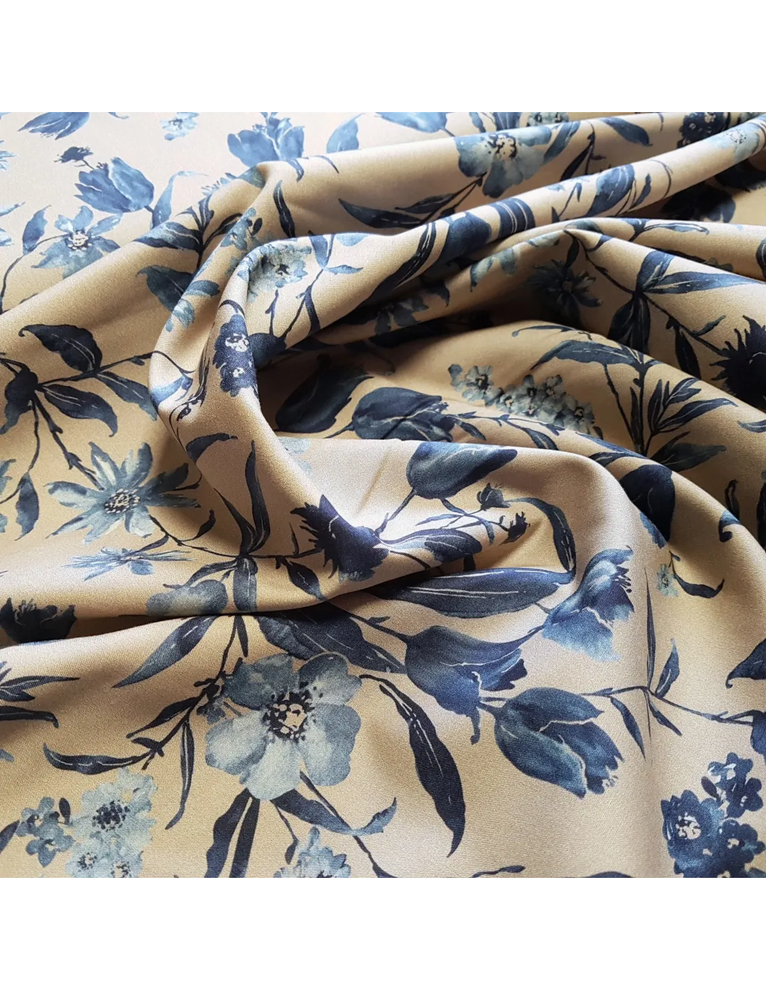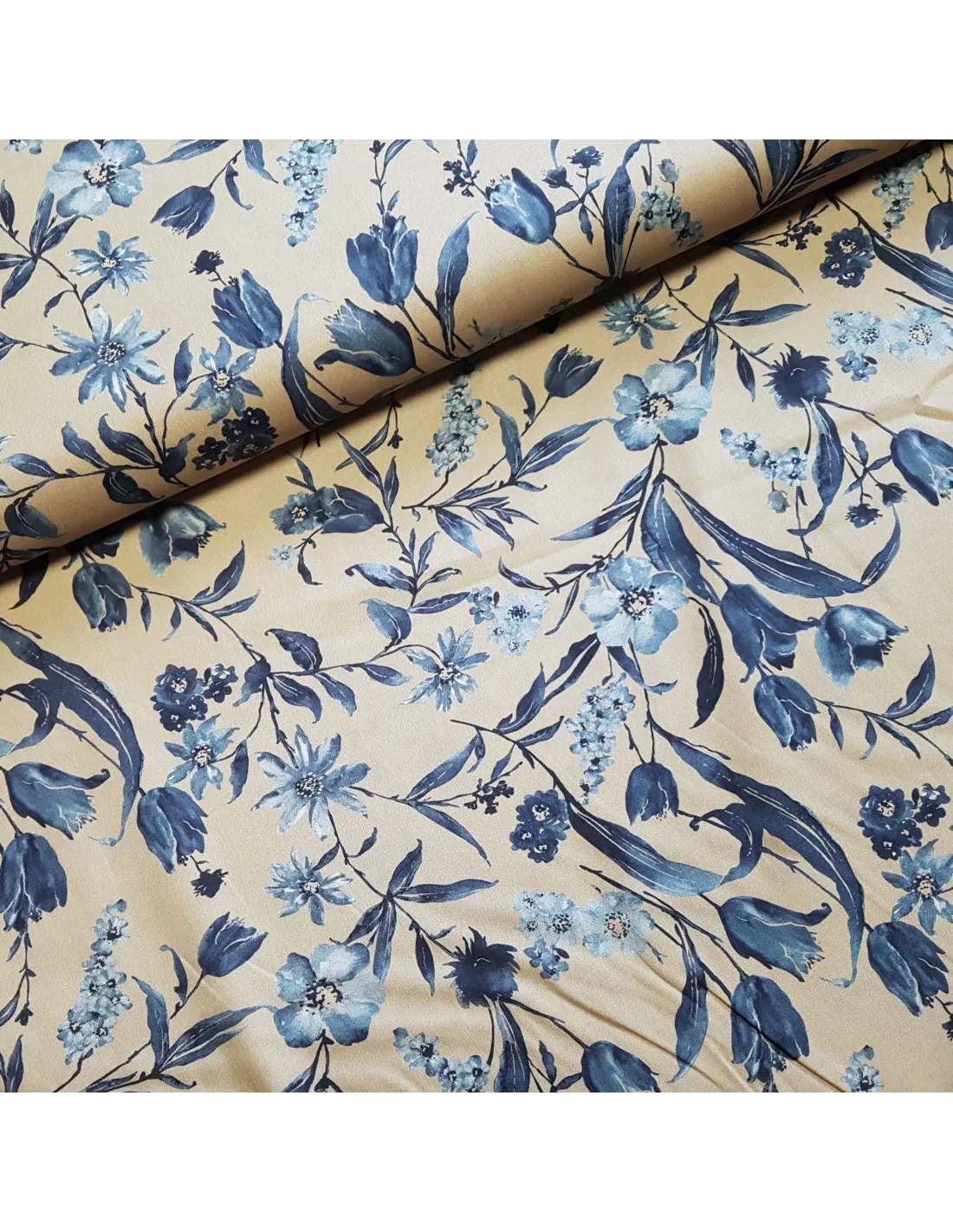 Popeline de coton, impression digitale, fleurs bleues sur fond taupe.