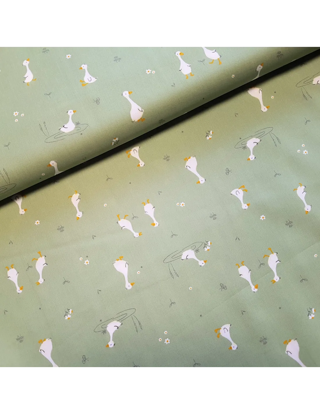 Popeline de coton les oies blanches sur fond vert clair.