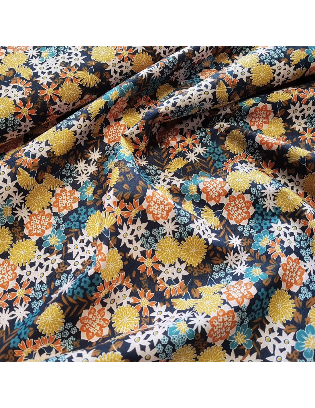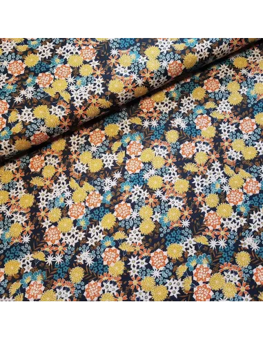 Cretonne de coton aux fleurs sur fond marine.