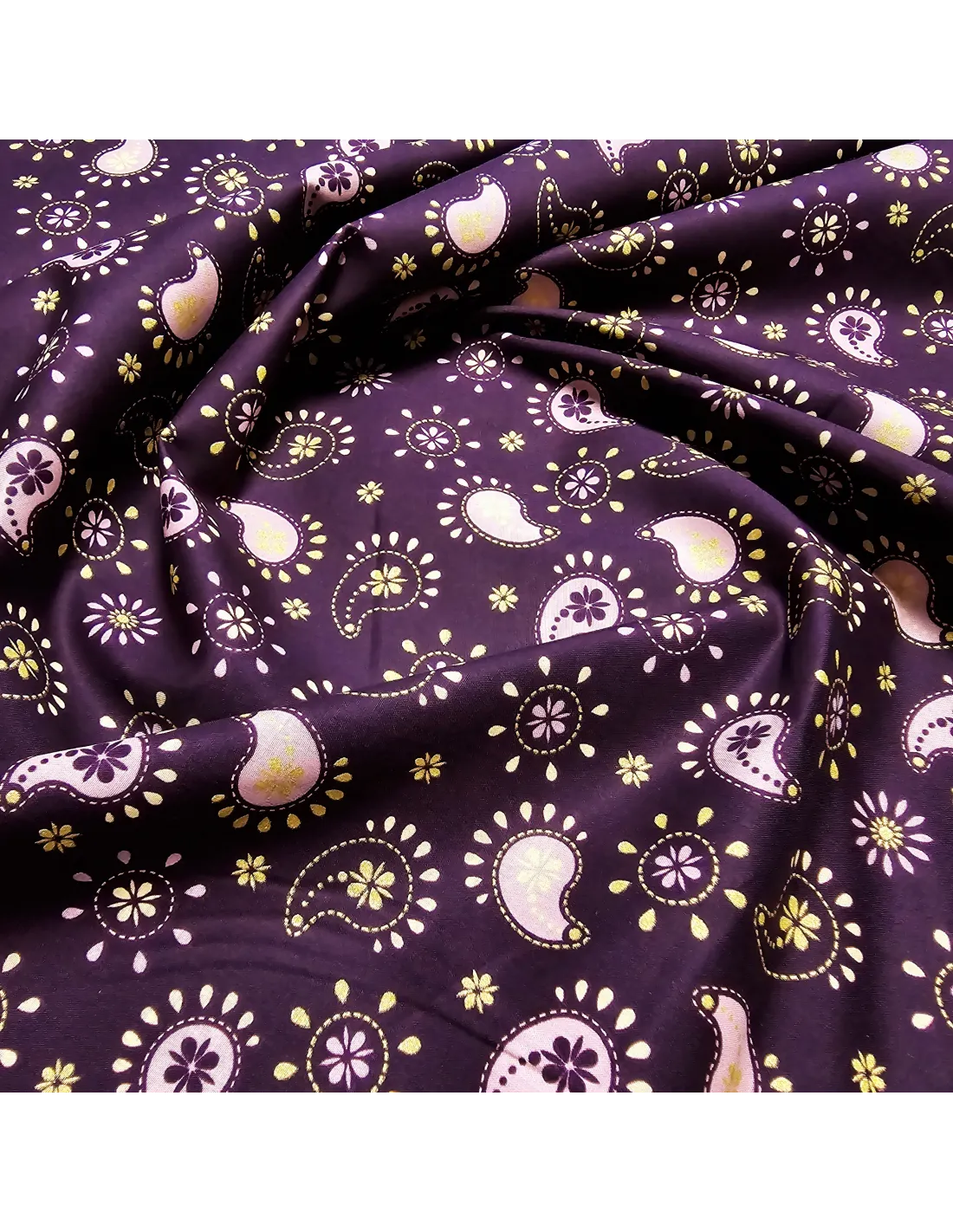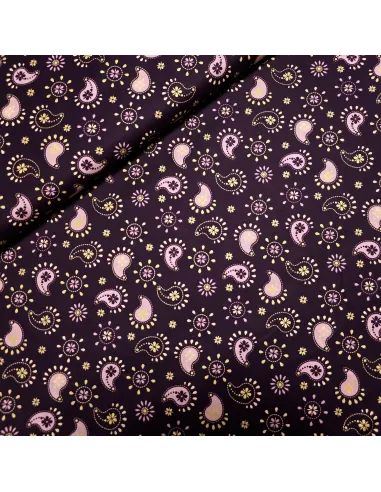 Popeline de coton aux motifs cachemire, dans les tons violets et dorés.