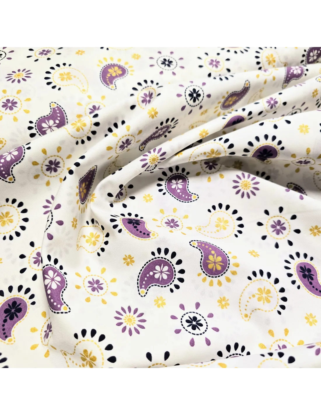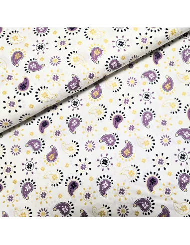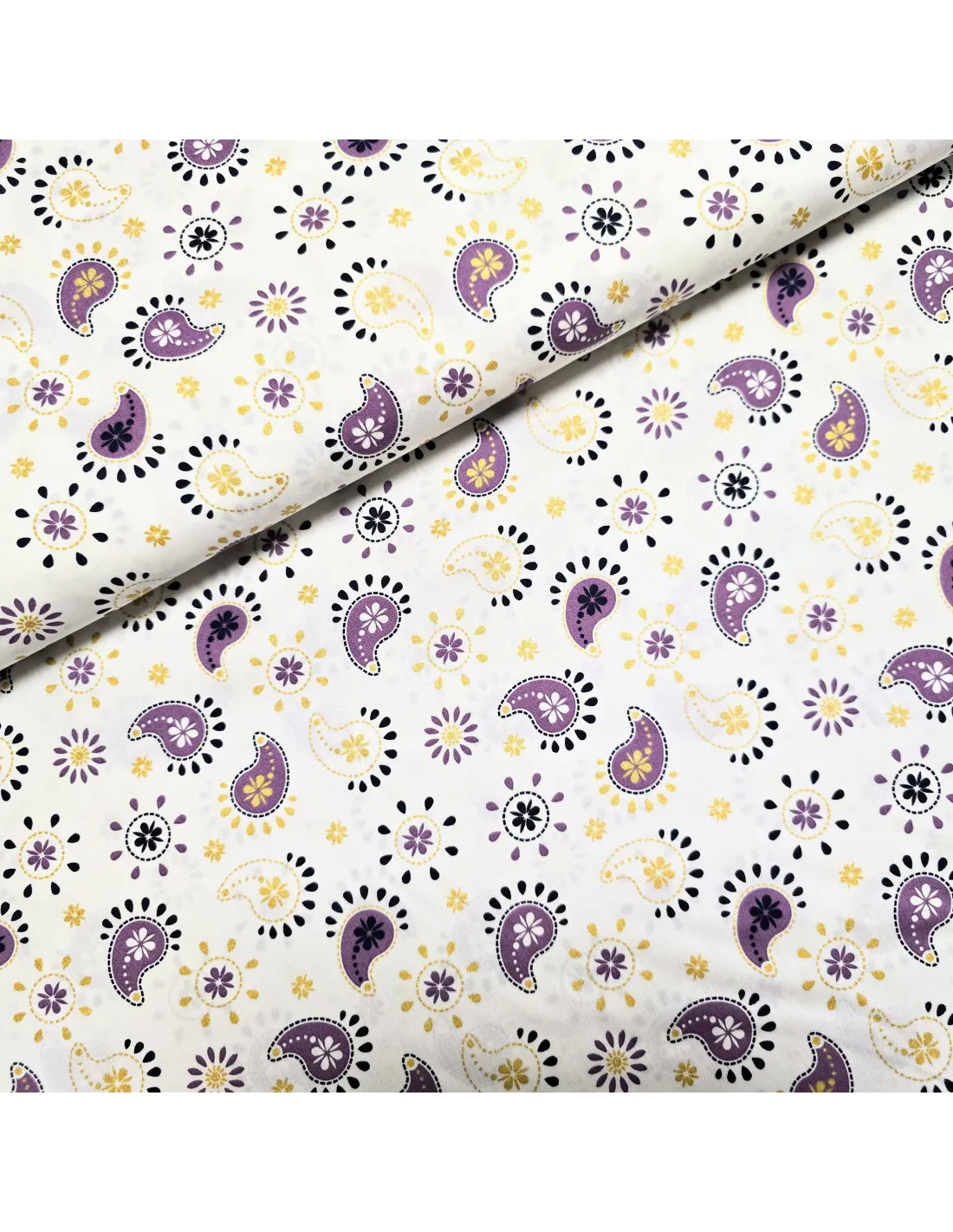 Popeline de coton aux motifs cachemire, dans les tons mauves et dorés sur fond blanc.