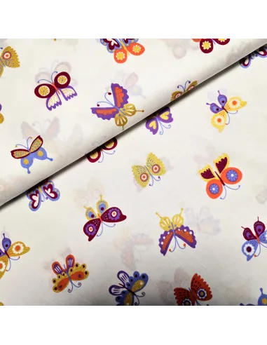Popeline de coton avec délicats papillons sur fond blanc, rehaussés de lurex. Design exclusif POPPY. Tissu doux, résistant, facile à coudre. Certifié Oeko-Tex® (sans substances nocives). Idéal pour vêtements légers et accessoires.